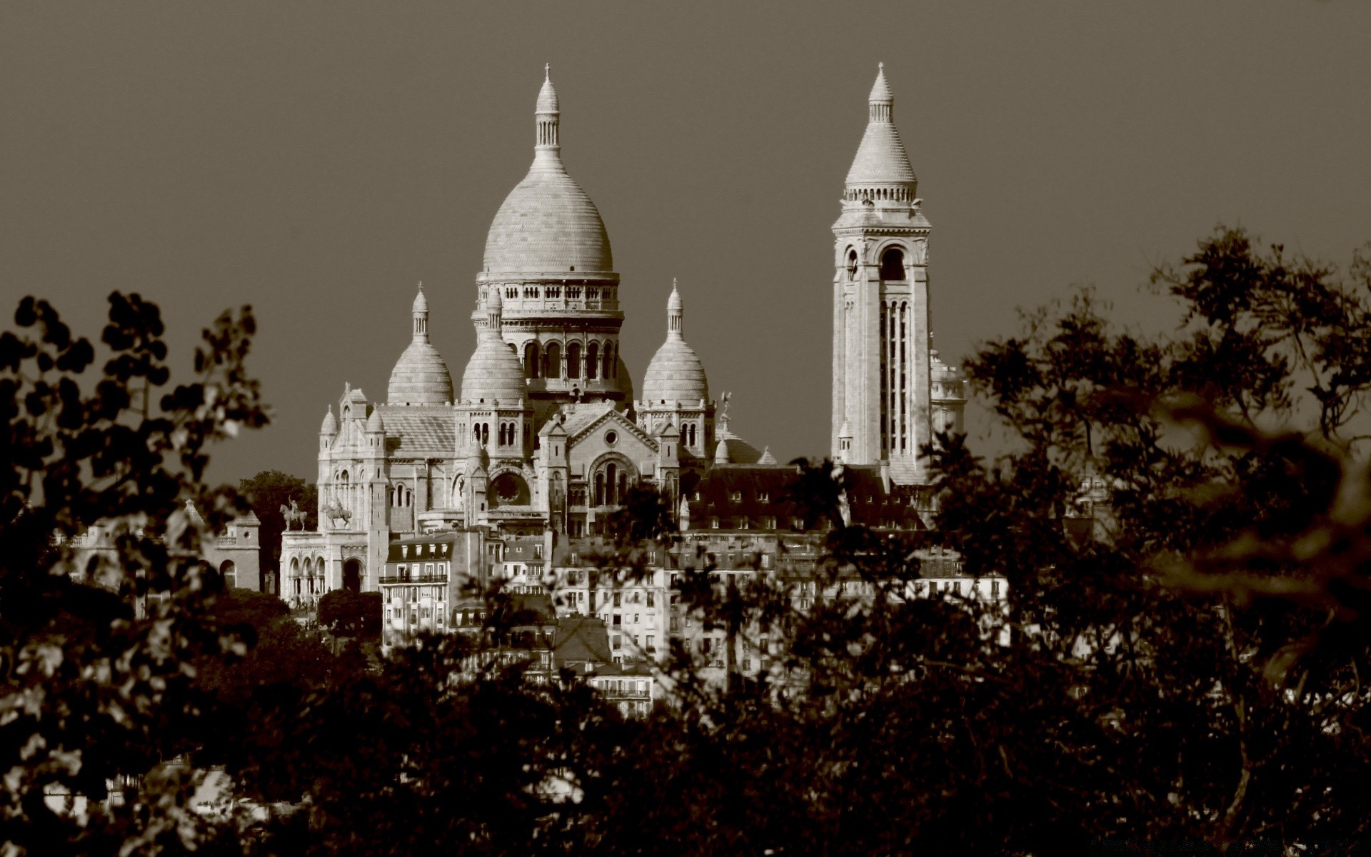 Schwarz-Weiß-Bild von Sehenswürdigkeiten wegen Baumkronen