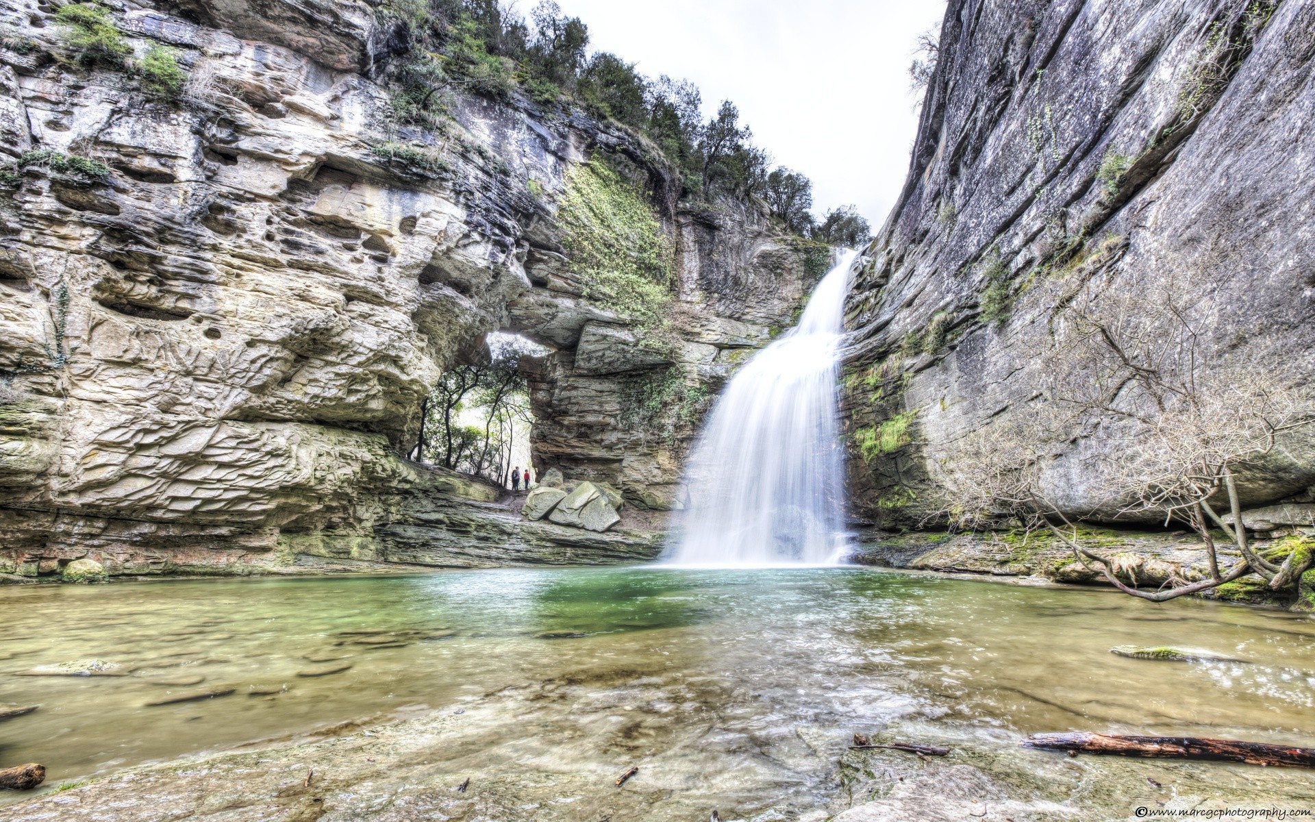 Ein niedriger Wasserfall, umgeben von grüner Vegetation