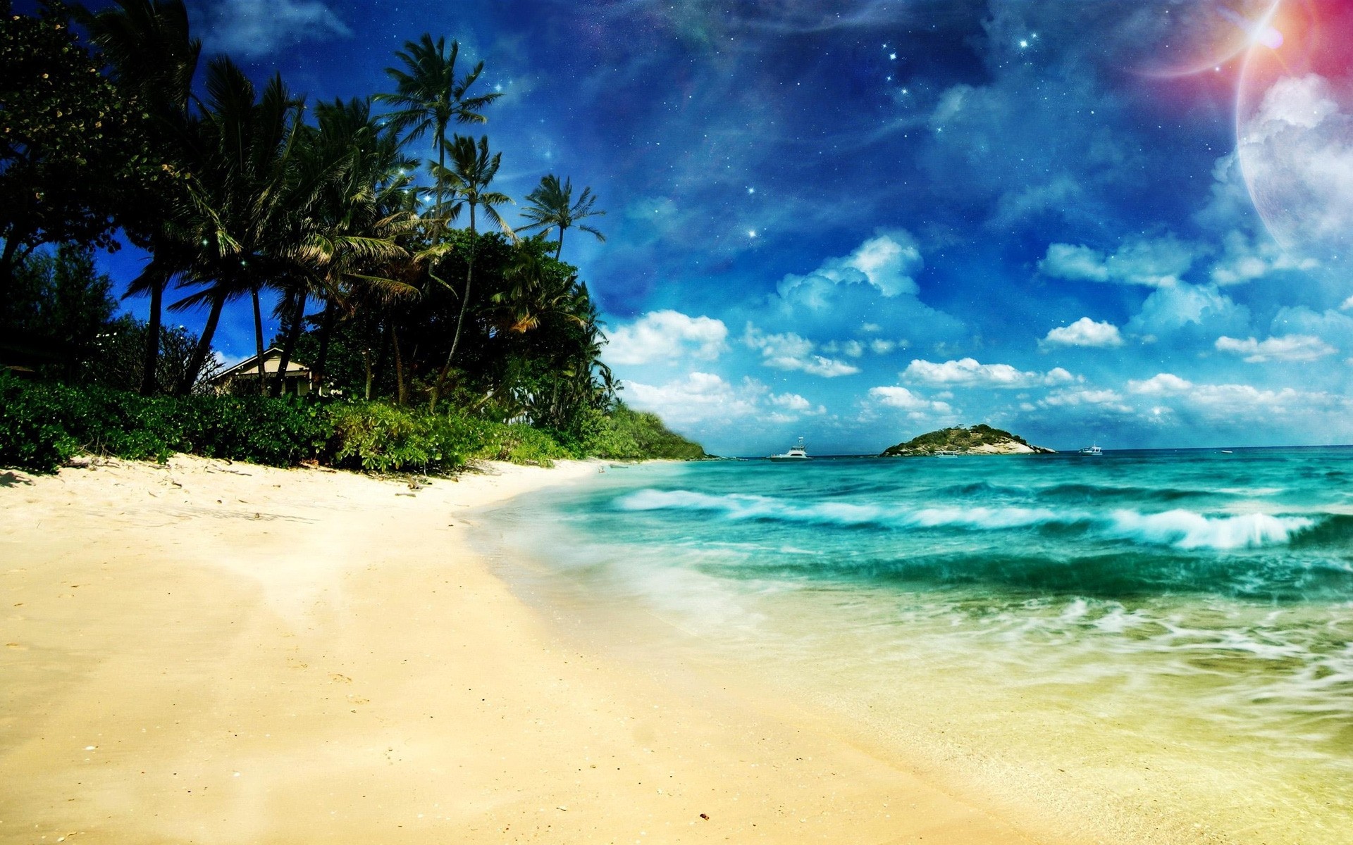 Resort-strand mit tropischen bäumen im hintergrund des sonnenuntergangsResort-Strand mit tropischen Bäumen im Hintergrund des Sonnenuntergangs
