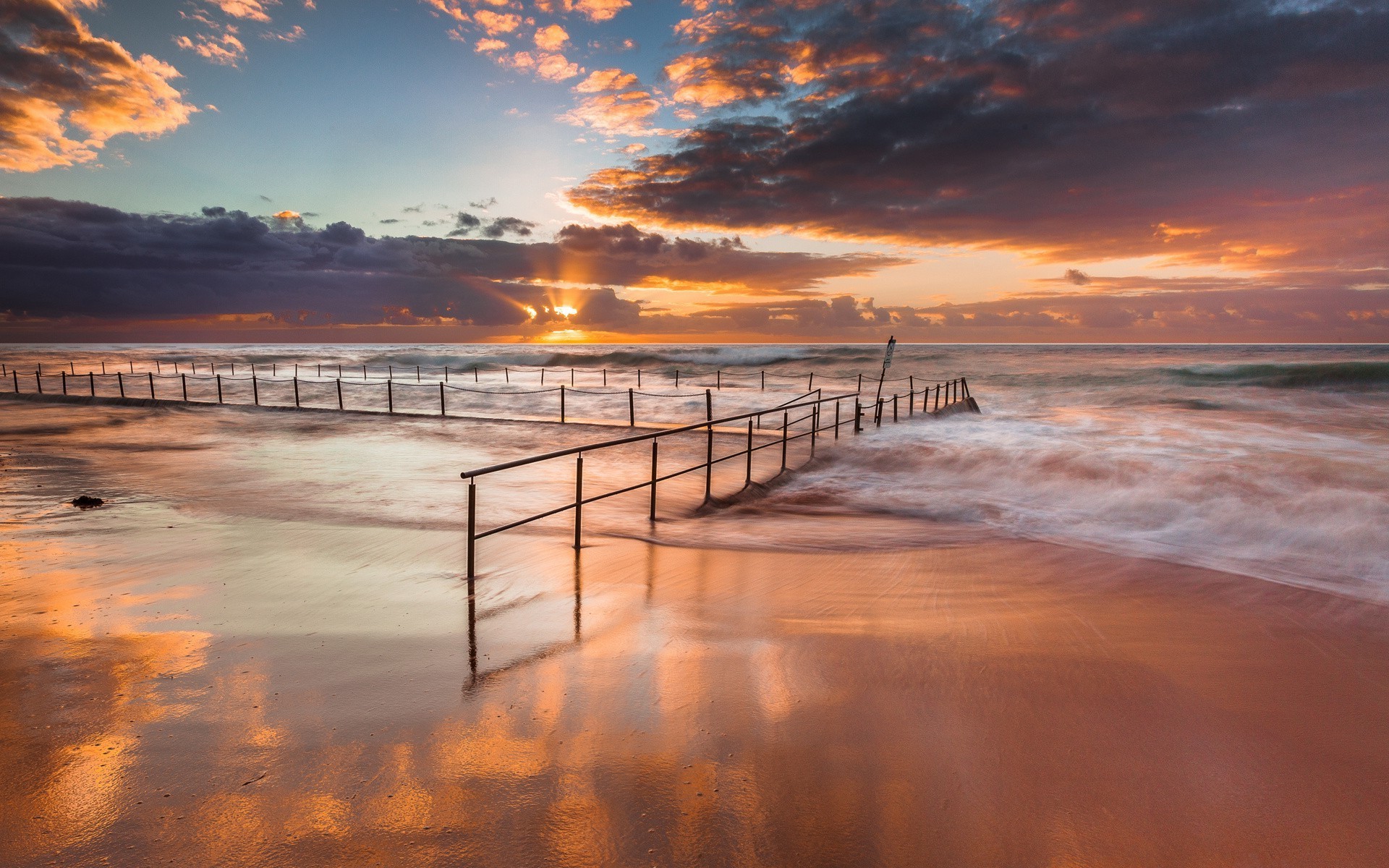 Die Meereswellen brechen gegen ein am Strand eingegrabenes Geländer