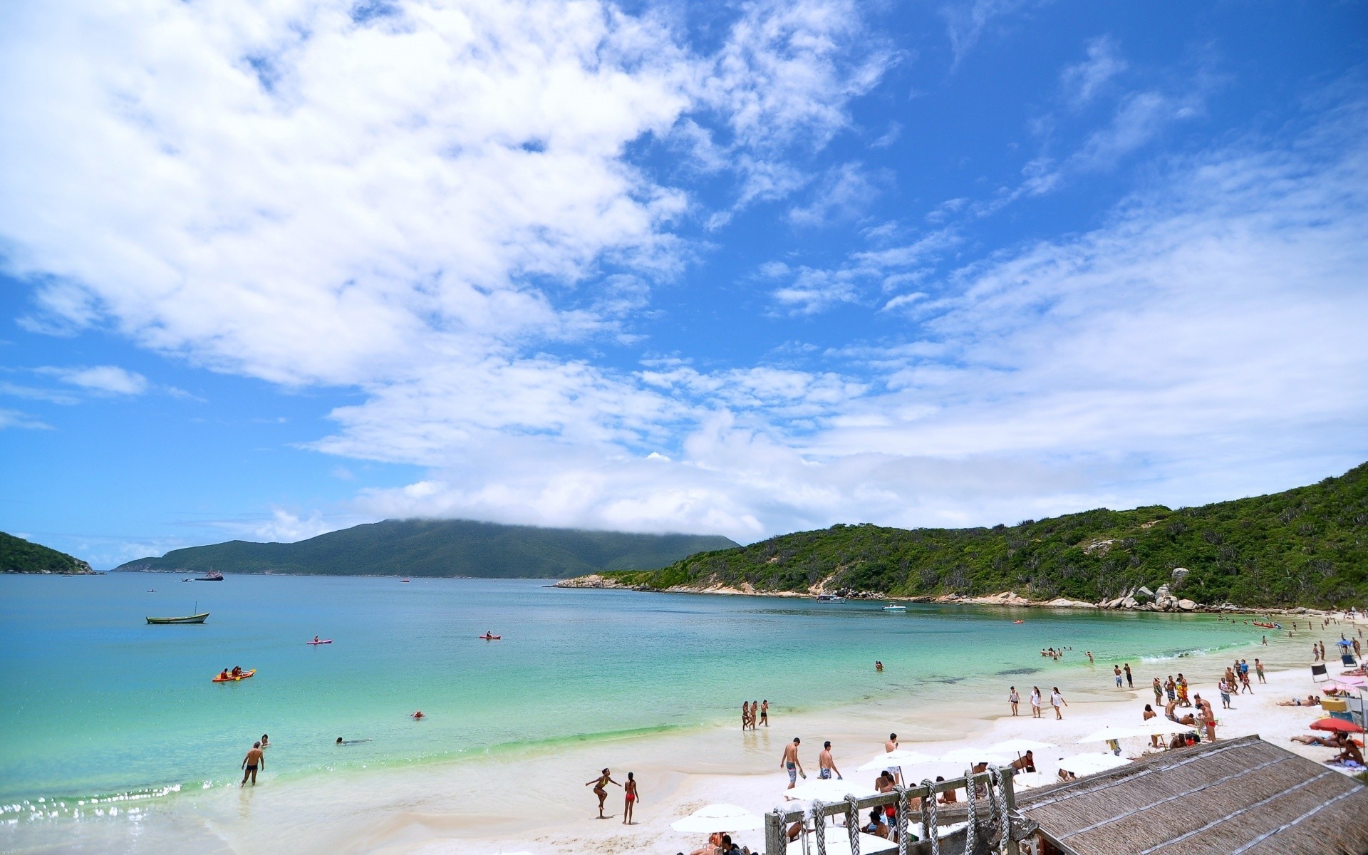 Am Meer und am Strand mit schöner Landschaft ist der Schauspieler