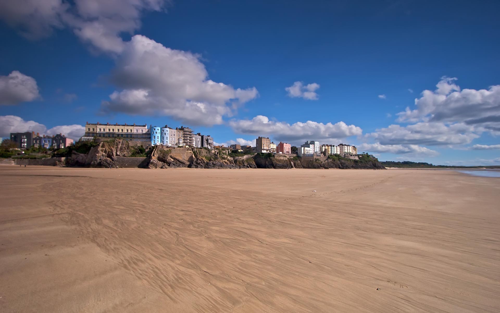 Ein Mann zieht die Koffer eines schönen Mädchens am Strand wie ein Burlak