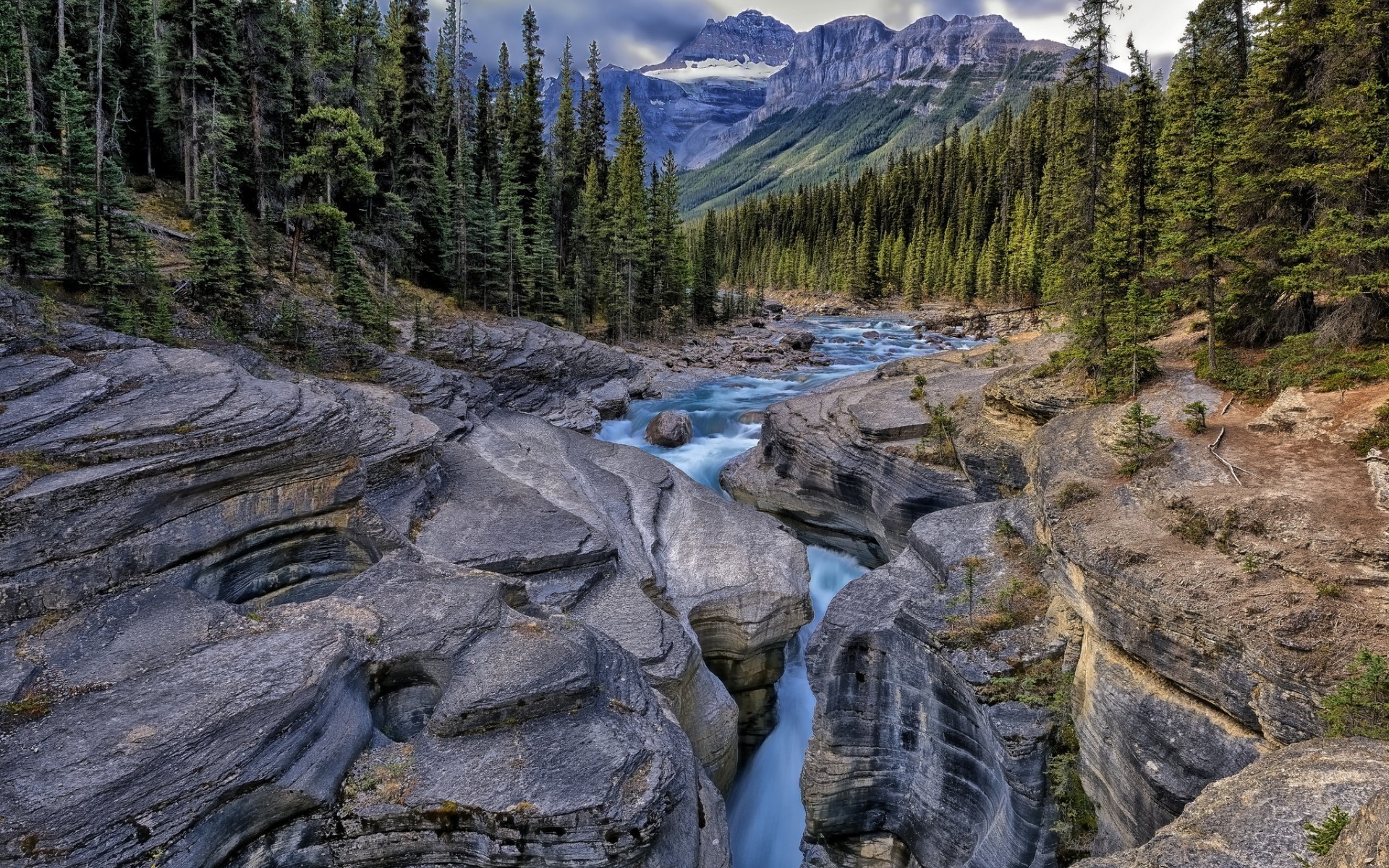 Ein Foto mit einem transparenten Teich unter den Steinen auf dem Hintergrund eines hohen Nadelwaldes und der Berge