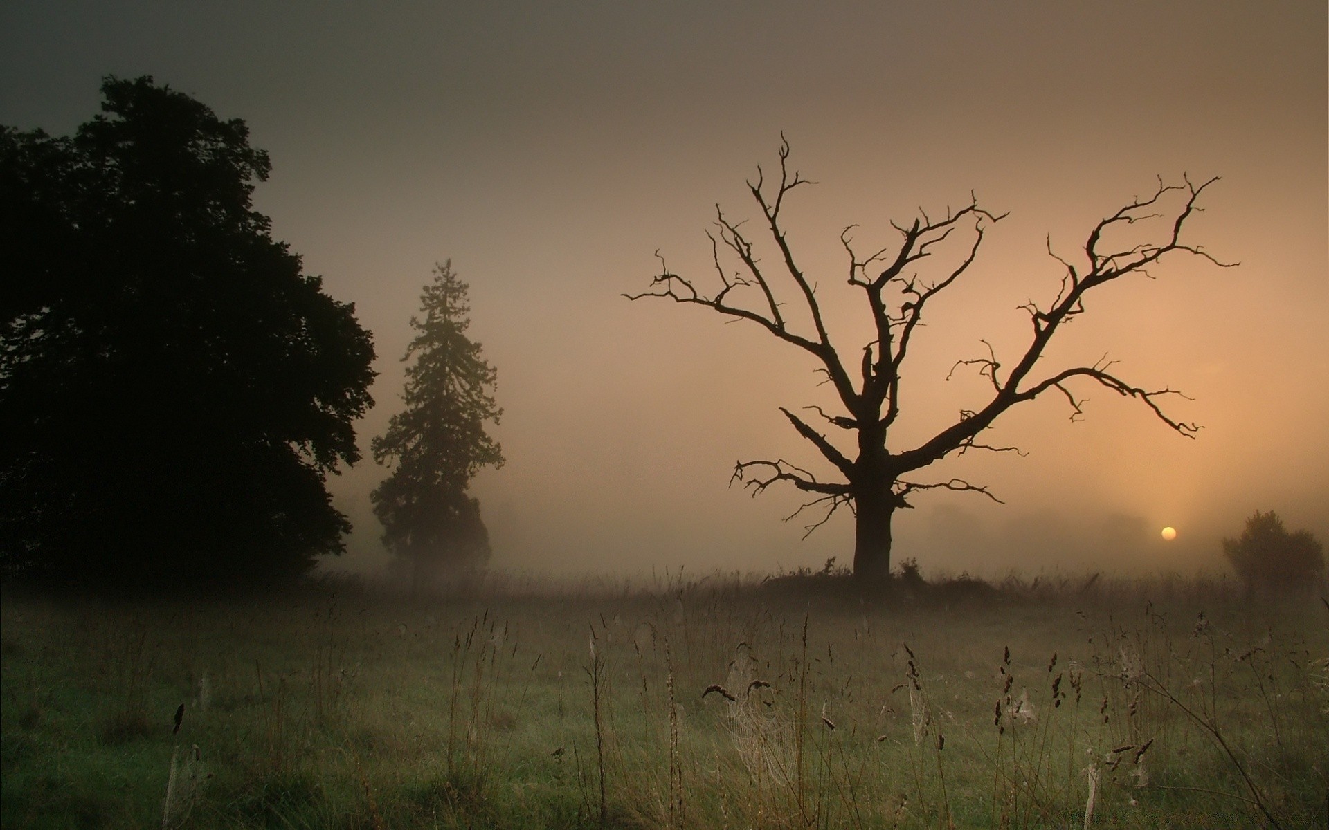 Sonnenuntergang, nebel und und der baum als symbol des abschiedsSonnenuntergang, Nebel und und der Baum als Symbol des Abschieds
