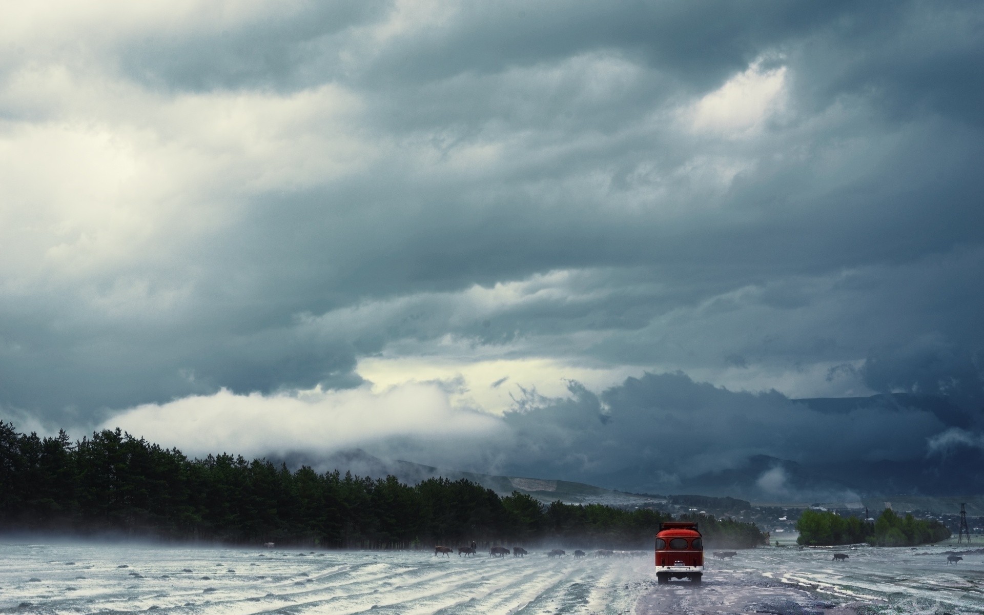 Neblige Landschaft. Winterwald unter dunklem Himmel
