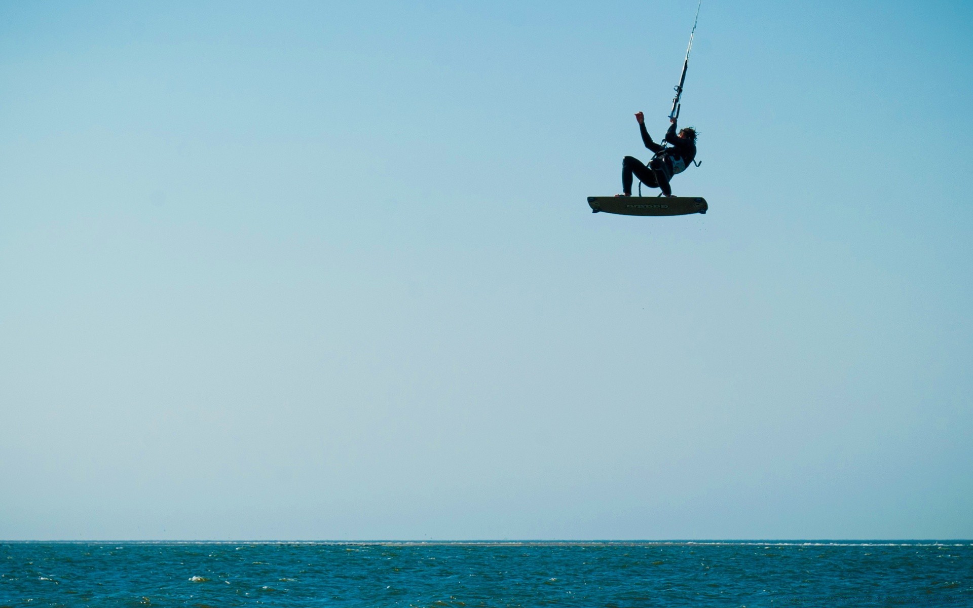 Auf dem Hintergrund des Himmels über dem Wasser ein Mann auf einer Tafel