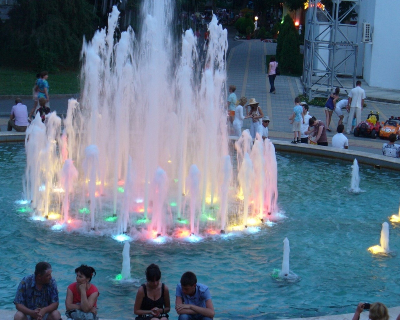 An einem Sommerabend sitzen Menschen am mit verschiedenen Farben beleuchteten Brunnen