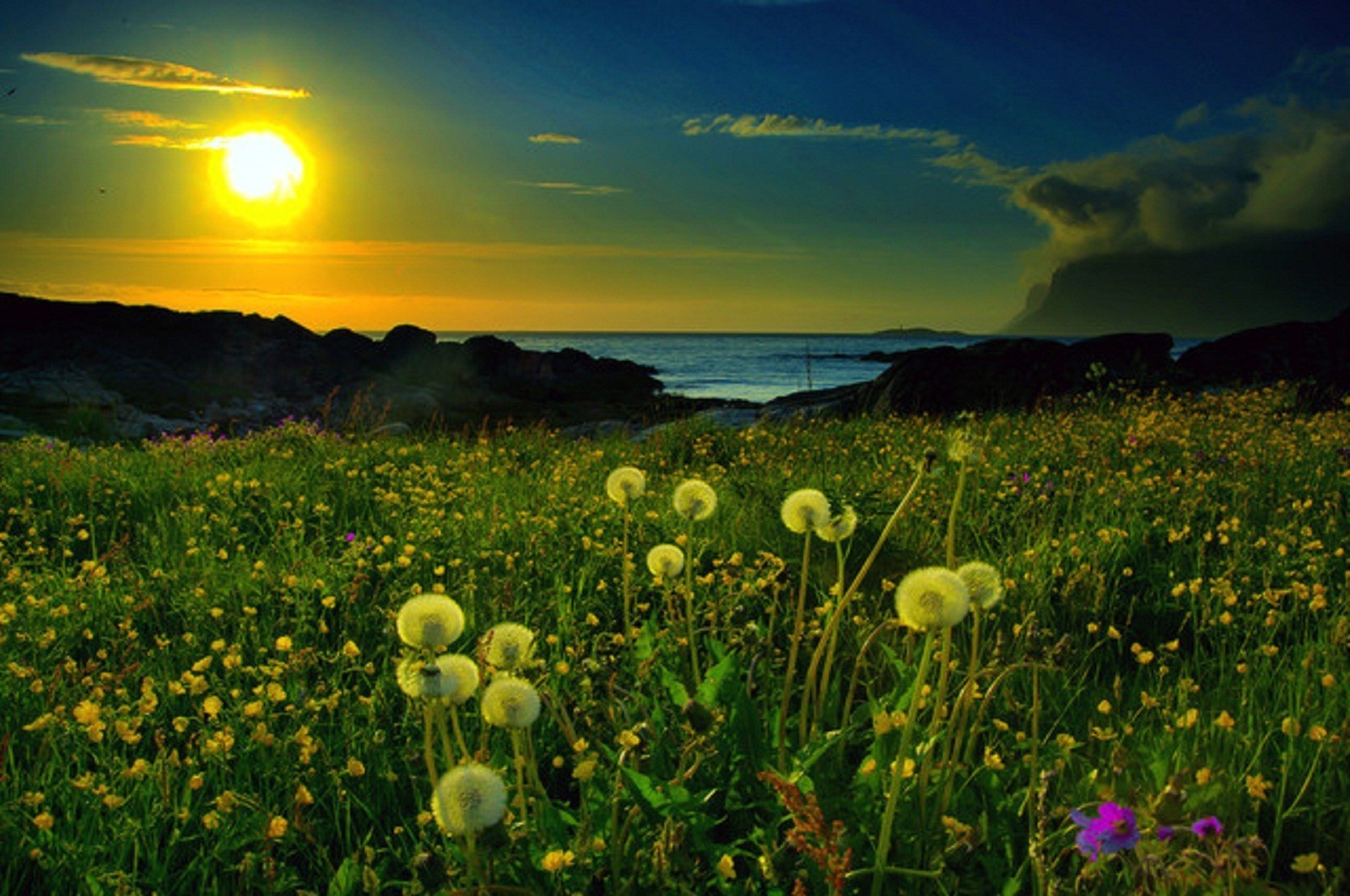 Morgendämmerung auf einer lichtung unter löwenzahn am meer