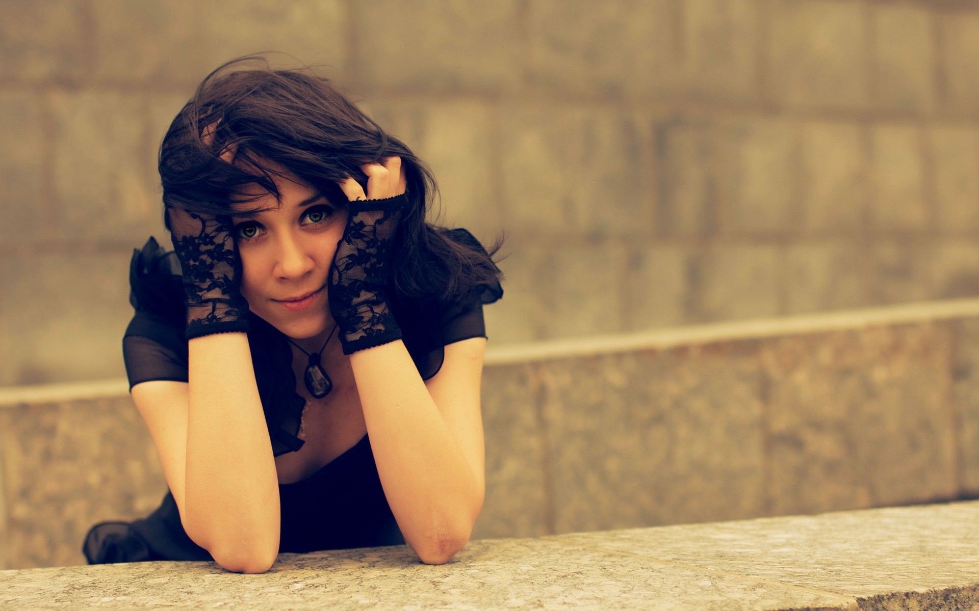 Das mädchen sitzt an einem sonnigen tag auf der treppeDas Mädchen sitzt an einem sonnigen Tag auf der Treppe