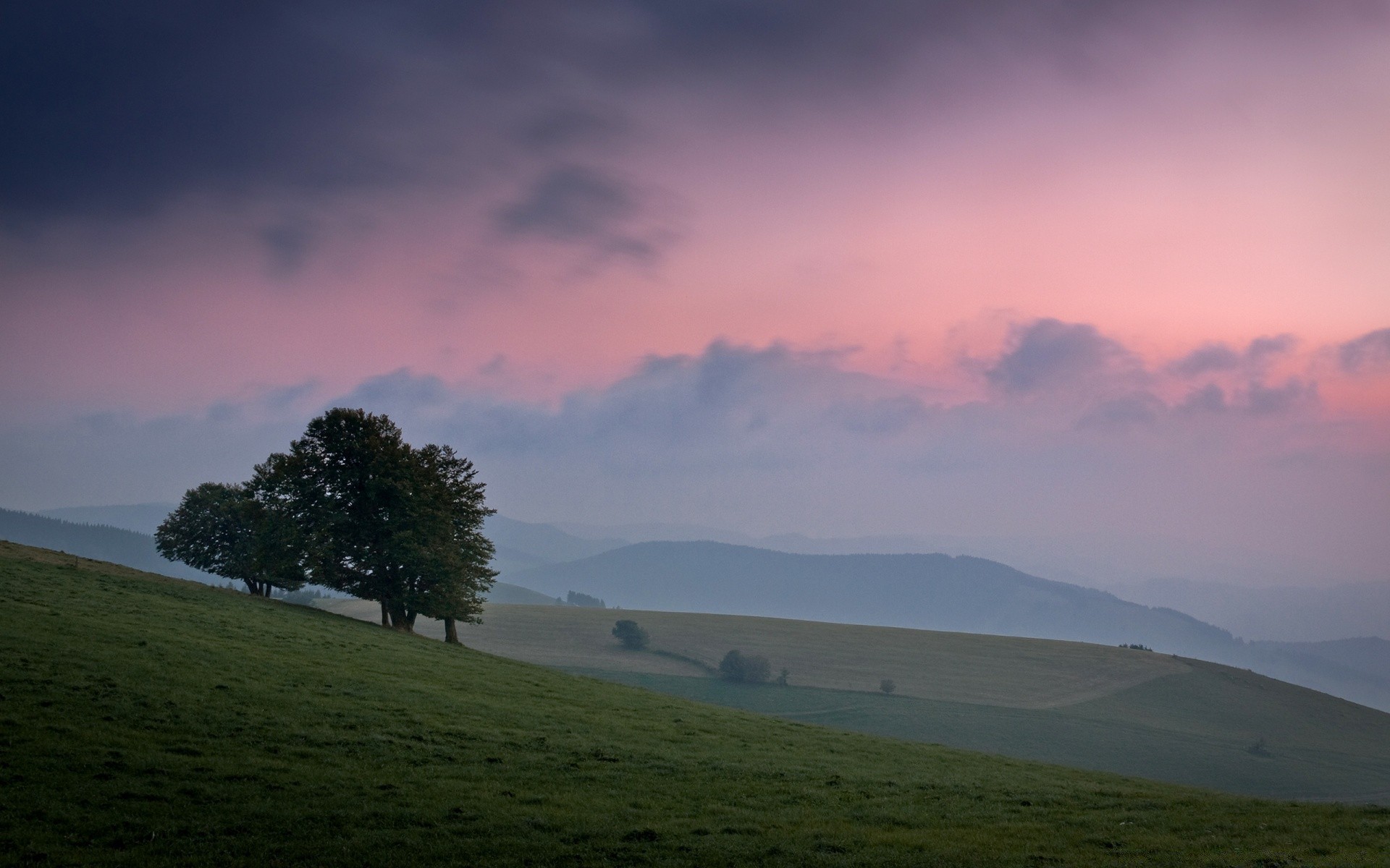 Einsame Bäume auf einem rosa und violetten Himmelshintergrund
