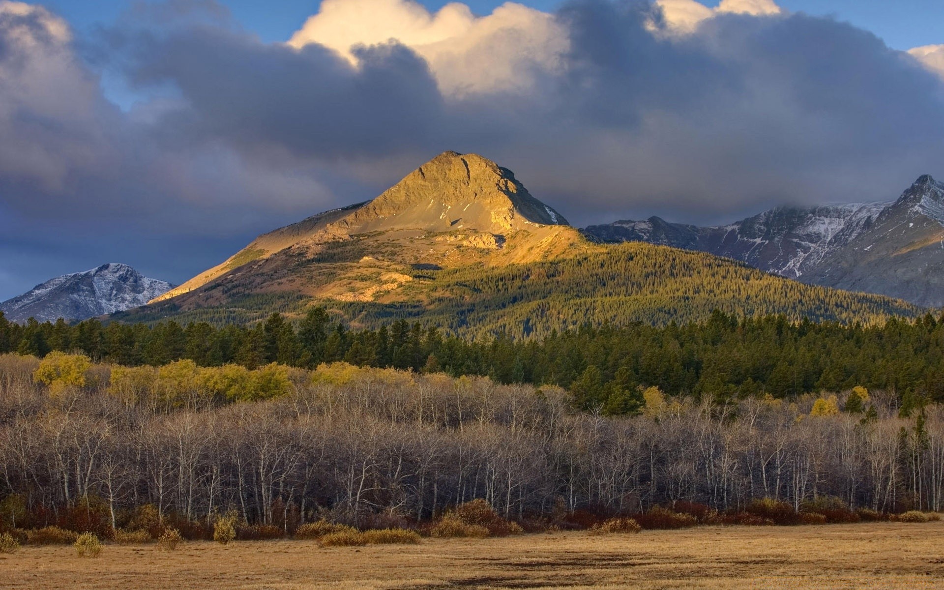 Herbstliche Berglandschaft vor dem Hintergrund eines düsteren Himmels