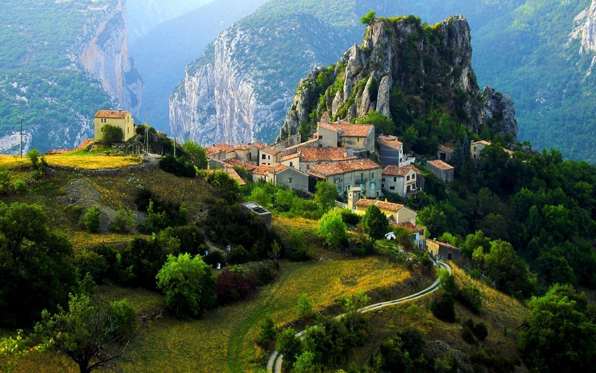 Fuß des berges felsen bäume gras dorf straßen schnee
