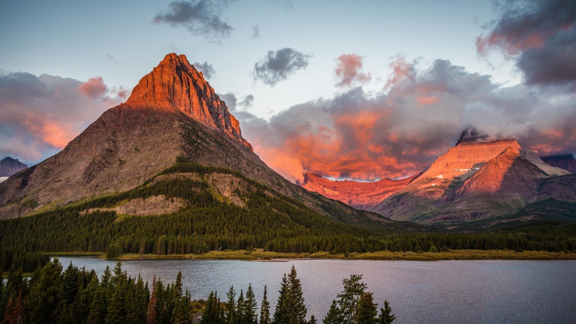 Malerische Landschaft. Herbstberge und See mit Wald