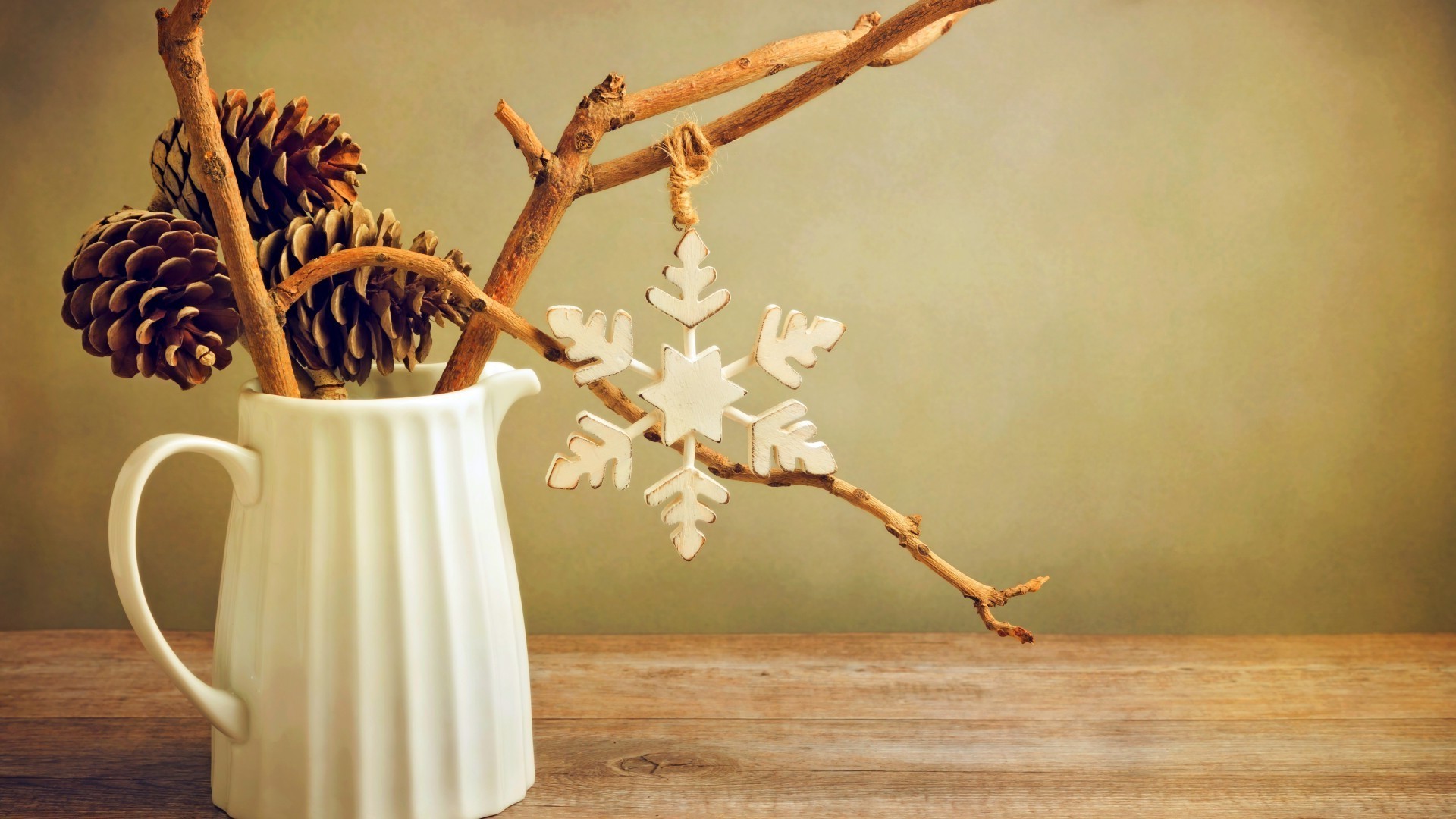 Stillleben mit Zweigen in einem Krug, Tannenzapfen und einer Schneeflocke