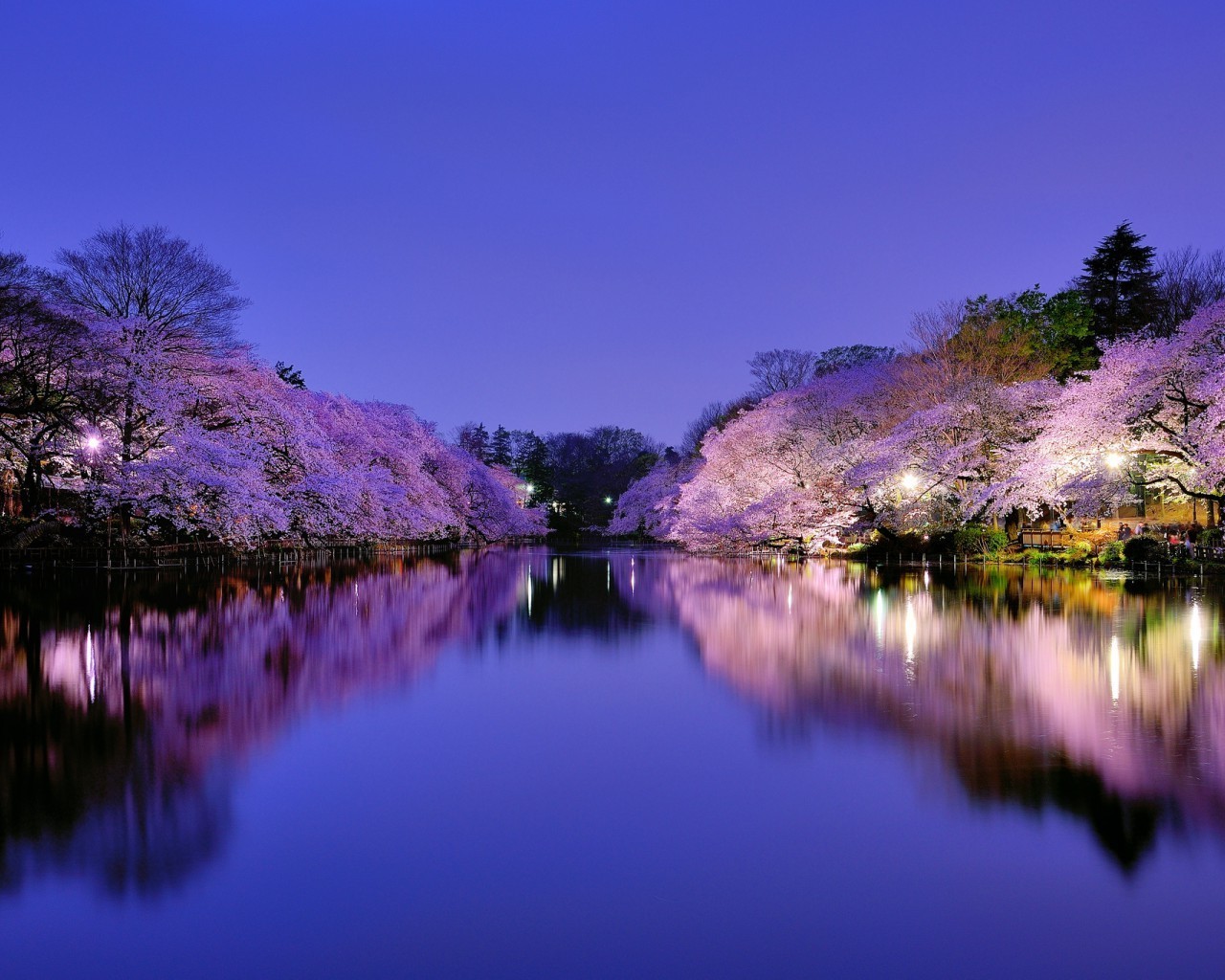 Blühende japanische Sakura über dem See