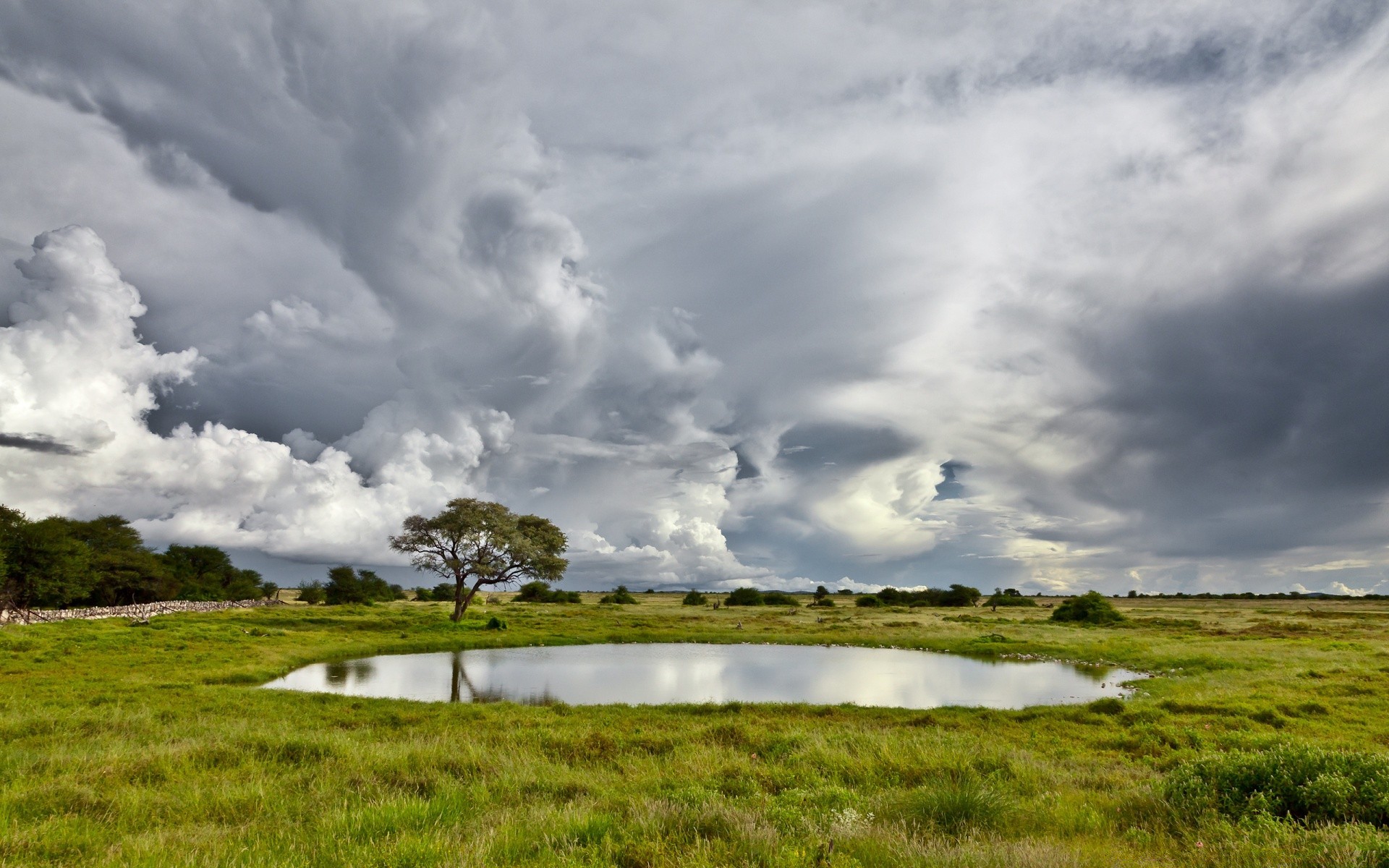 Einsamer See mit einem Baum inmitten einer Lichtung