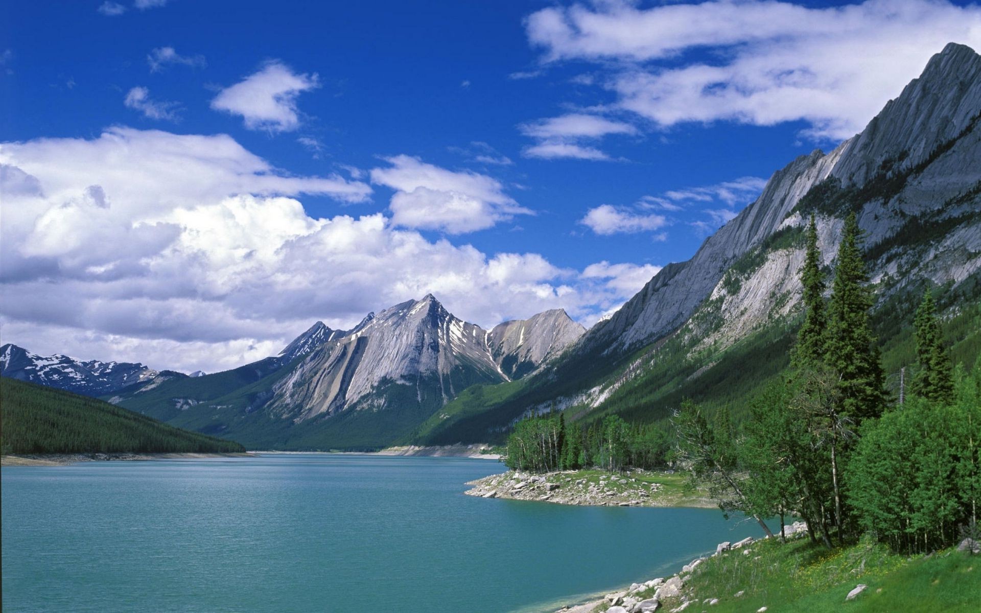 Landschaft von See , Bäumen und blauem Himmel mit Wolken