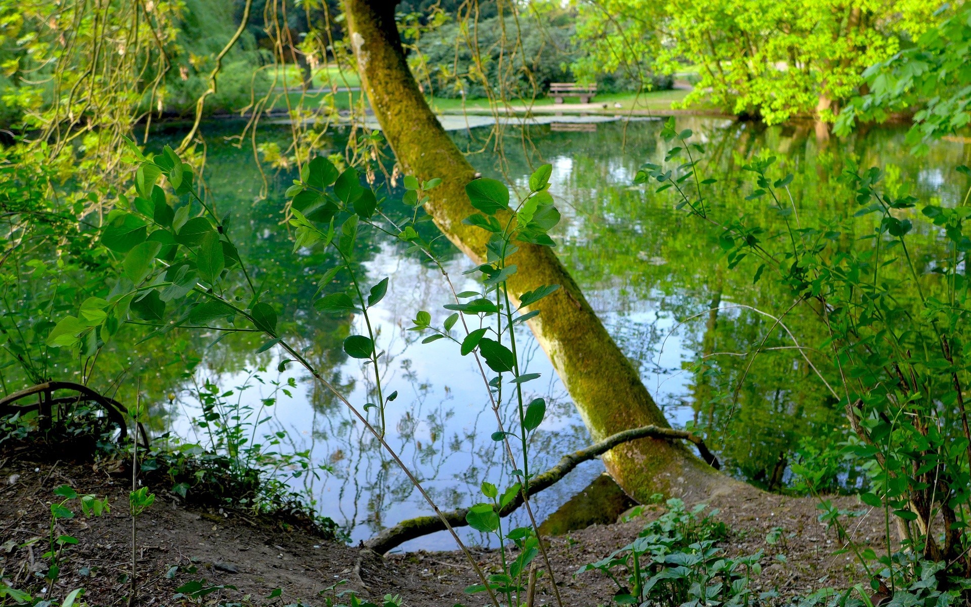 Eine abgewinkelte Weide am See, ein Spiegelbild des Grüns im Wasser
