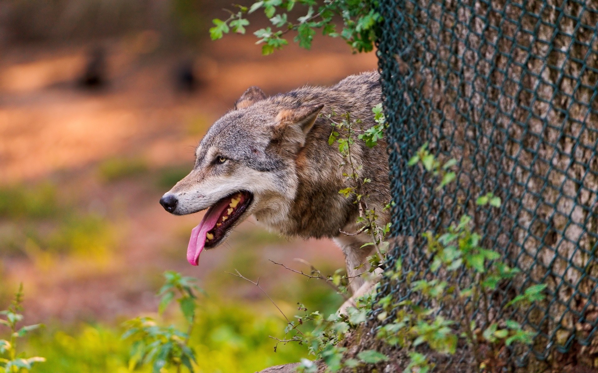 Ein Wolf mit ausgestreckter Zunge schaut hinter einem Baum hervor