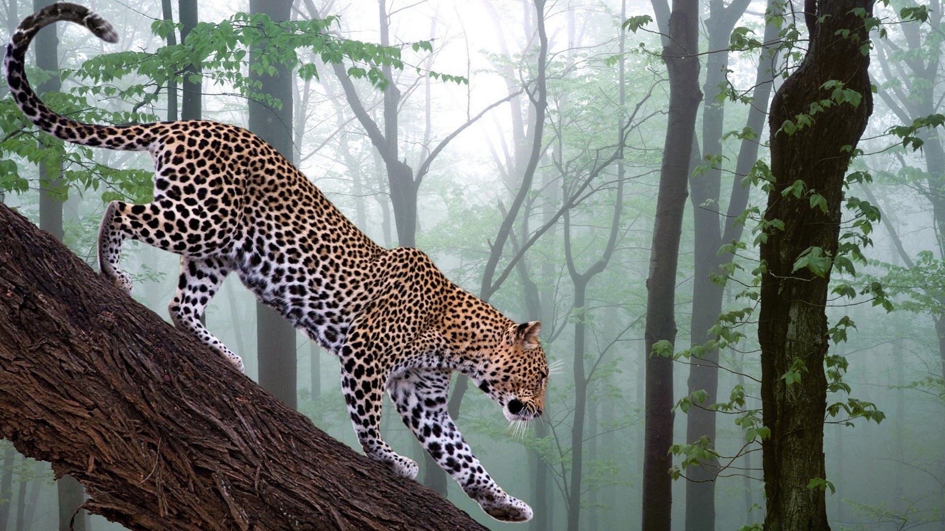 Ein Leopard klettert über die Baumspitzen