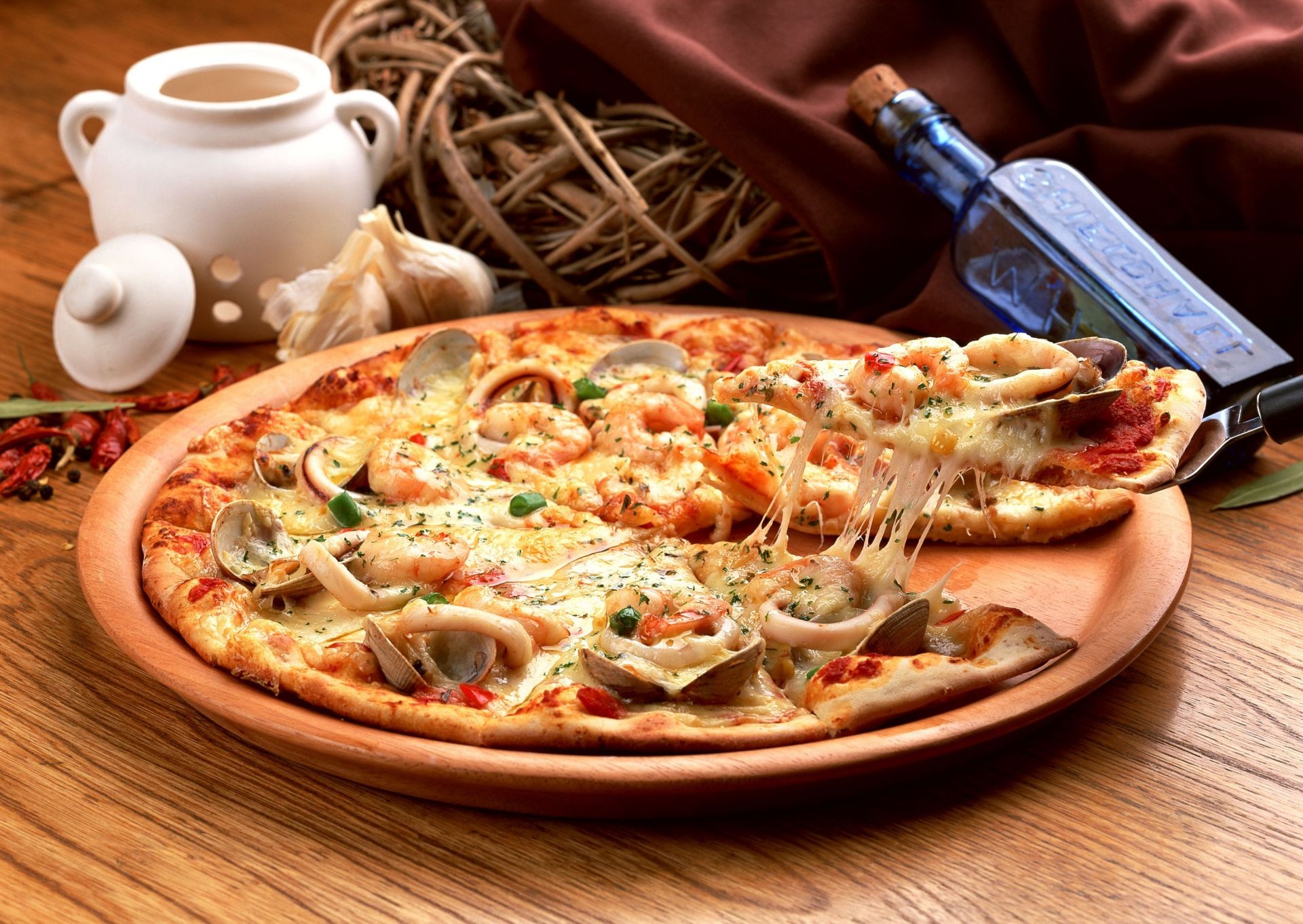 Ein Stück Pizza mit Hühnchen und Pilzen auf einem weißen Teller mit schwarzen Streifen
