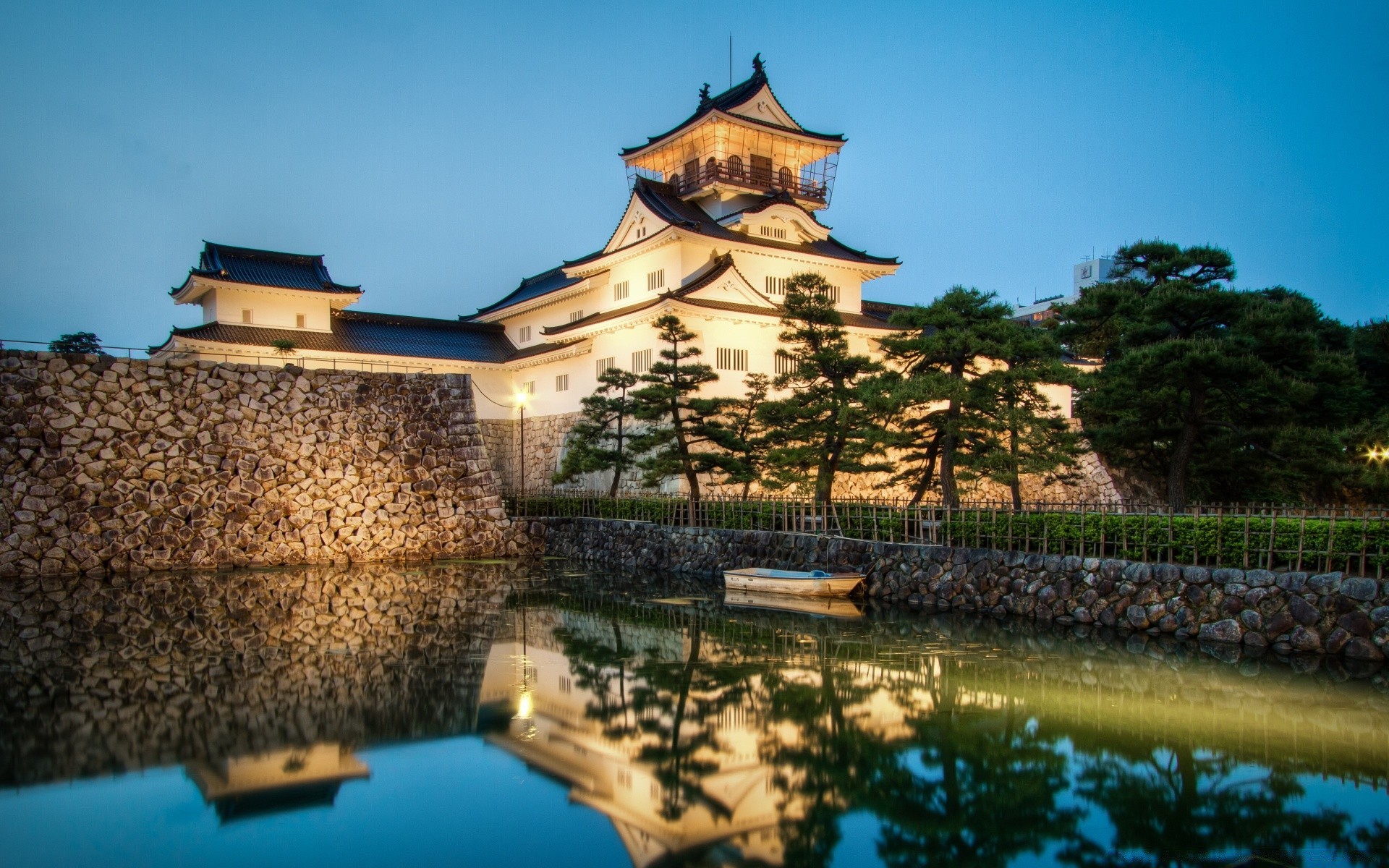 Chinesische Häuser und krumme Kiefern in der Nähe von Wasser