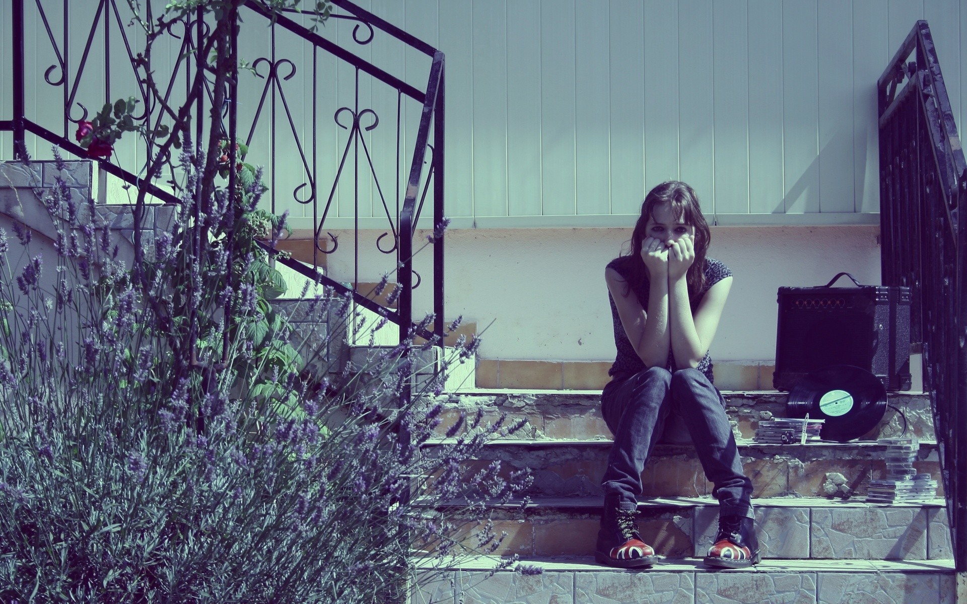 Das Mädchen sitzt an einem sonnigen Tag auf der Treppe