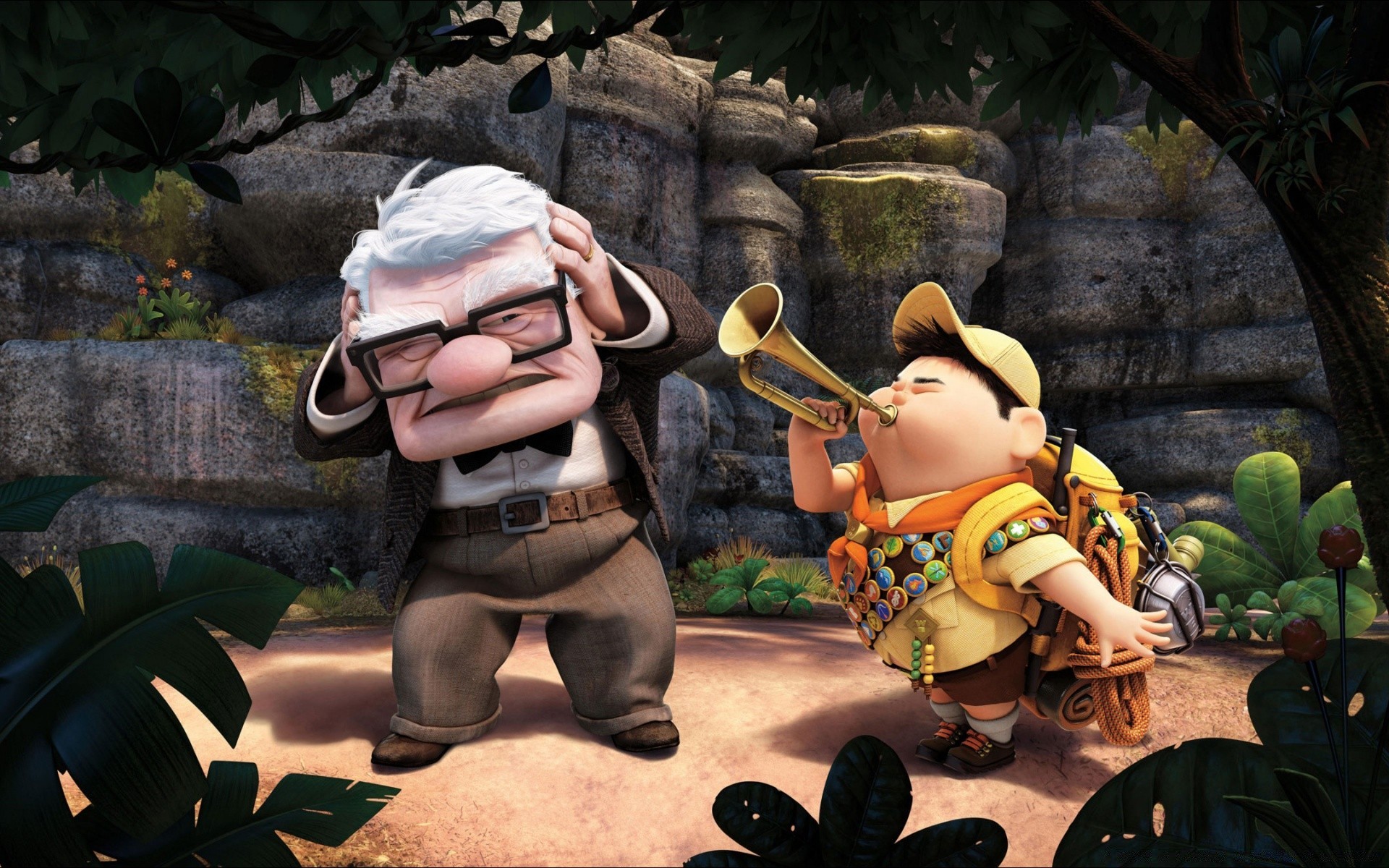 Bild aus dem cartoon up mit großvater und enkel mit trompete