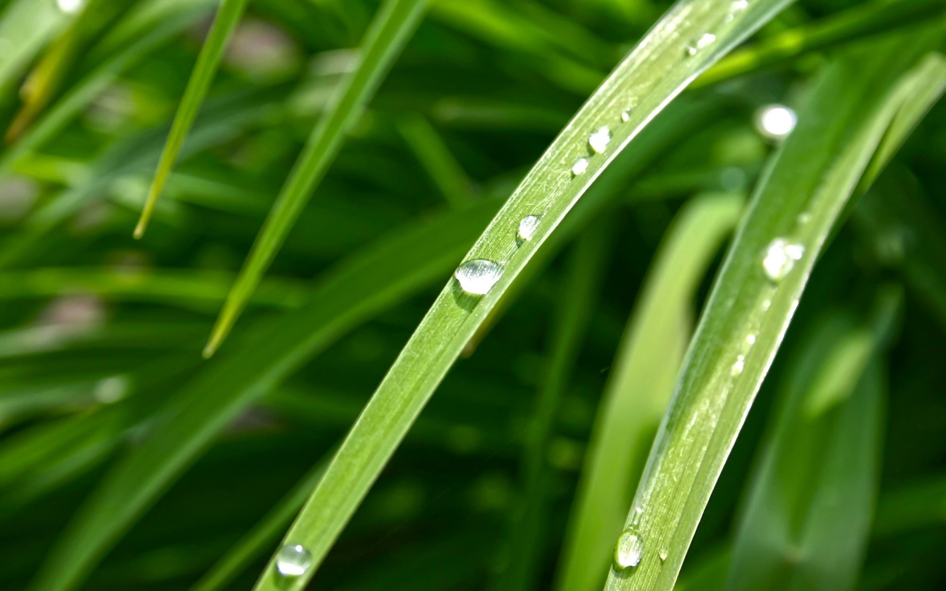 Nahaufnahme von Gras auf einer grünen Wiese mit Tautropfen übersät