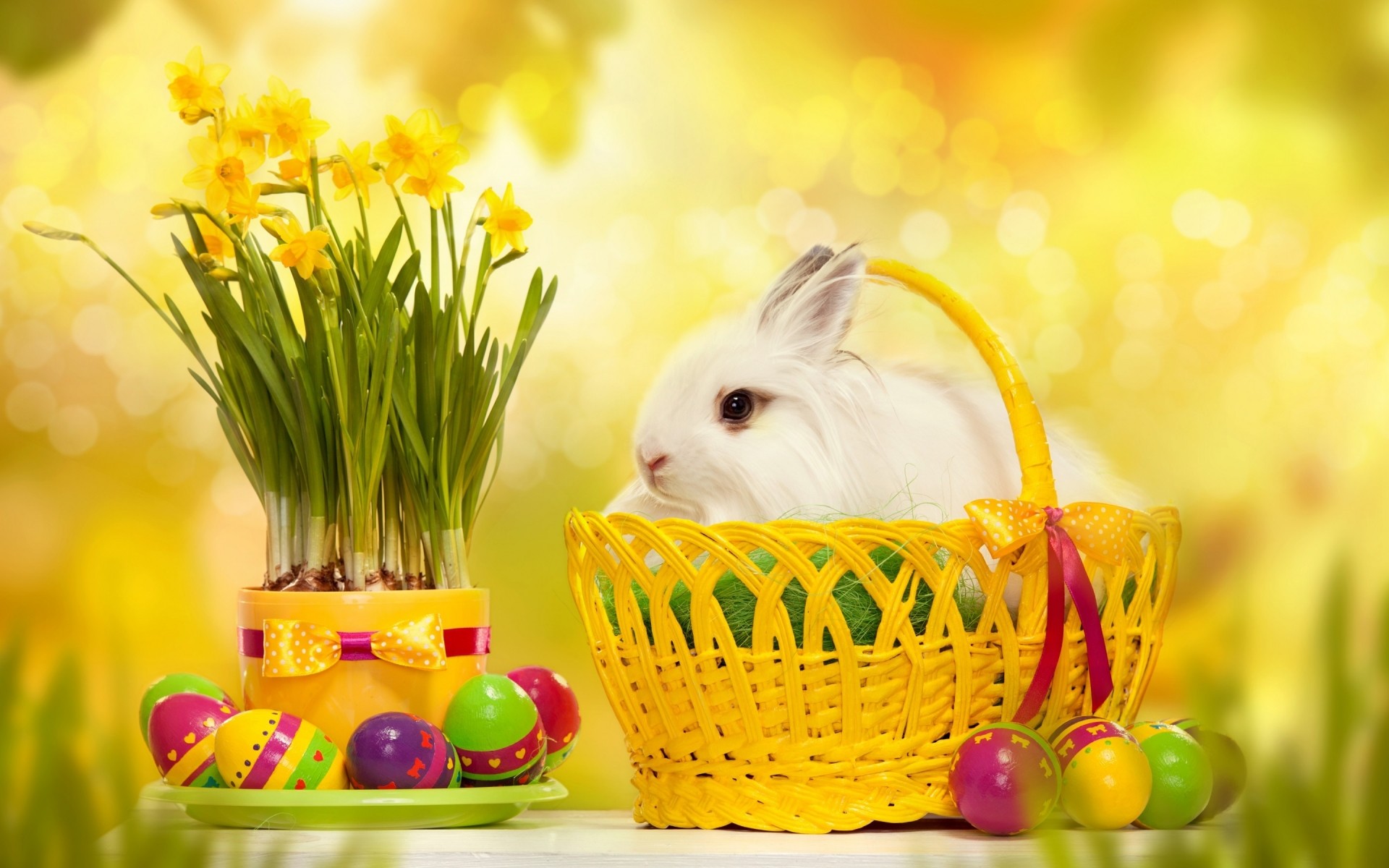 Süßer Korb mit Kaninchen und Hoden