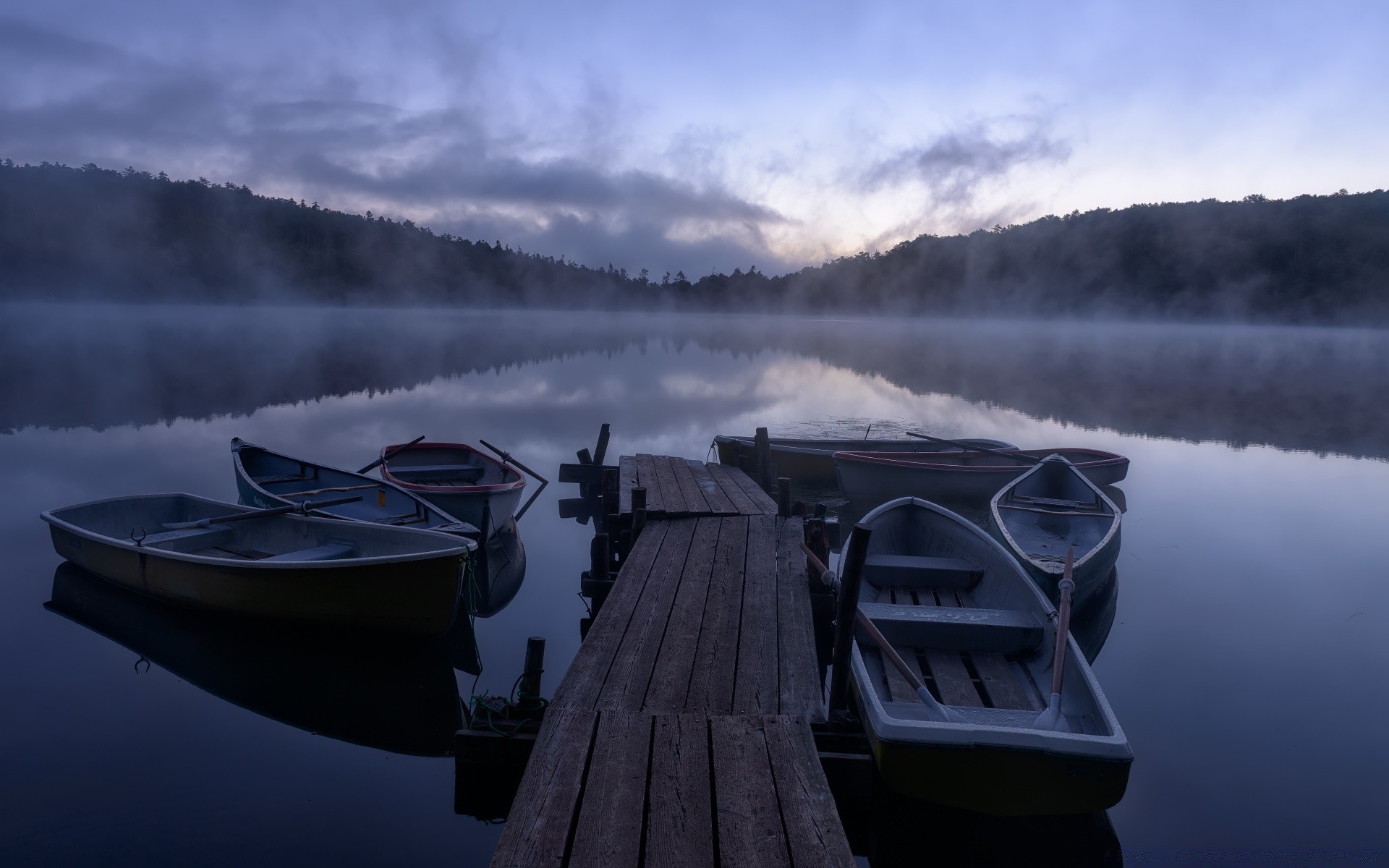 Der fluss. brettersteg. boote auf dem wasser. unscharfer hintergrundDer Fluss. Brettersteg. Boote auf dem Wasser. Unscharfer Hintergrund
