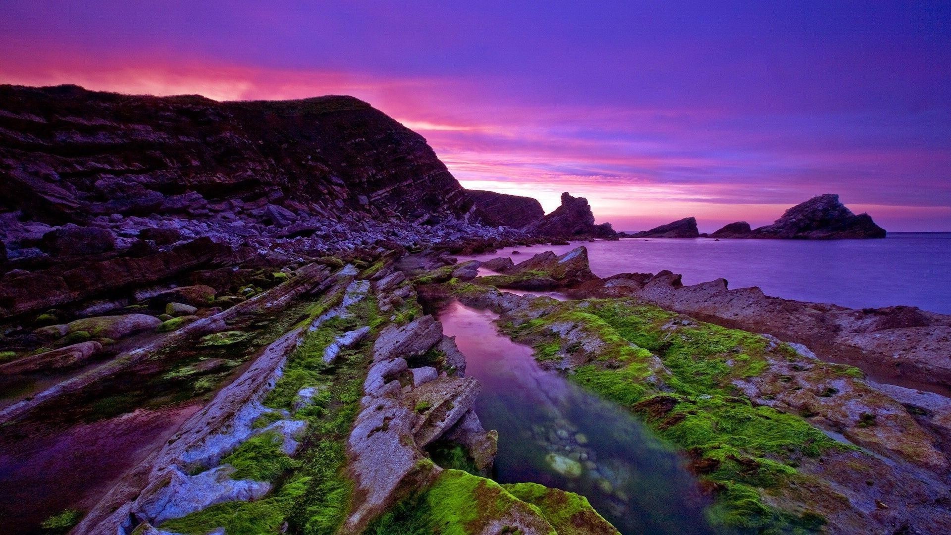 Die kalte Morgendämmerung beleuchtet die riesigen Steine am Ufer