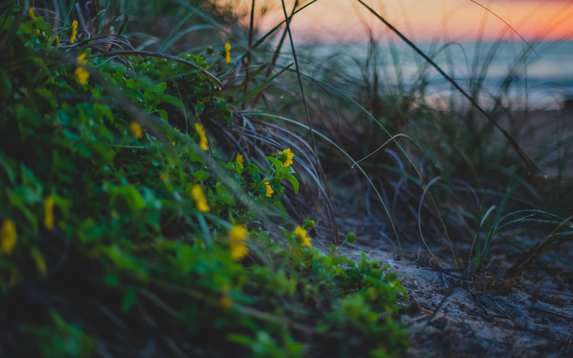 Sonnenuntergang am Ufer eines mit Gras und kleinen Blumen bedeckten Sees