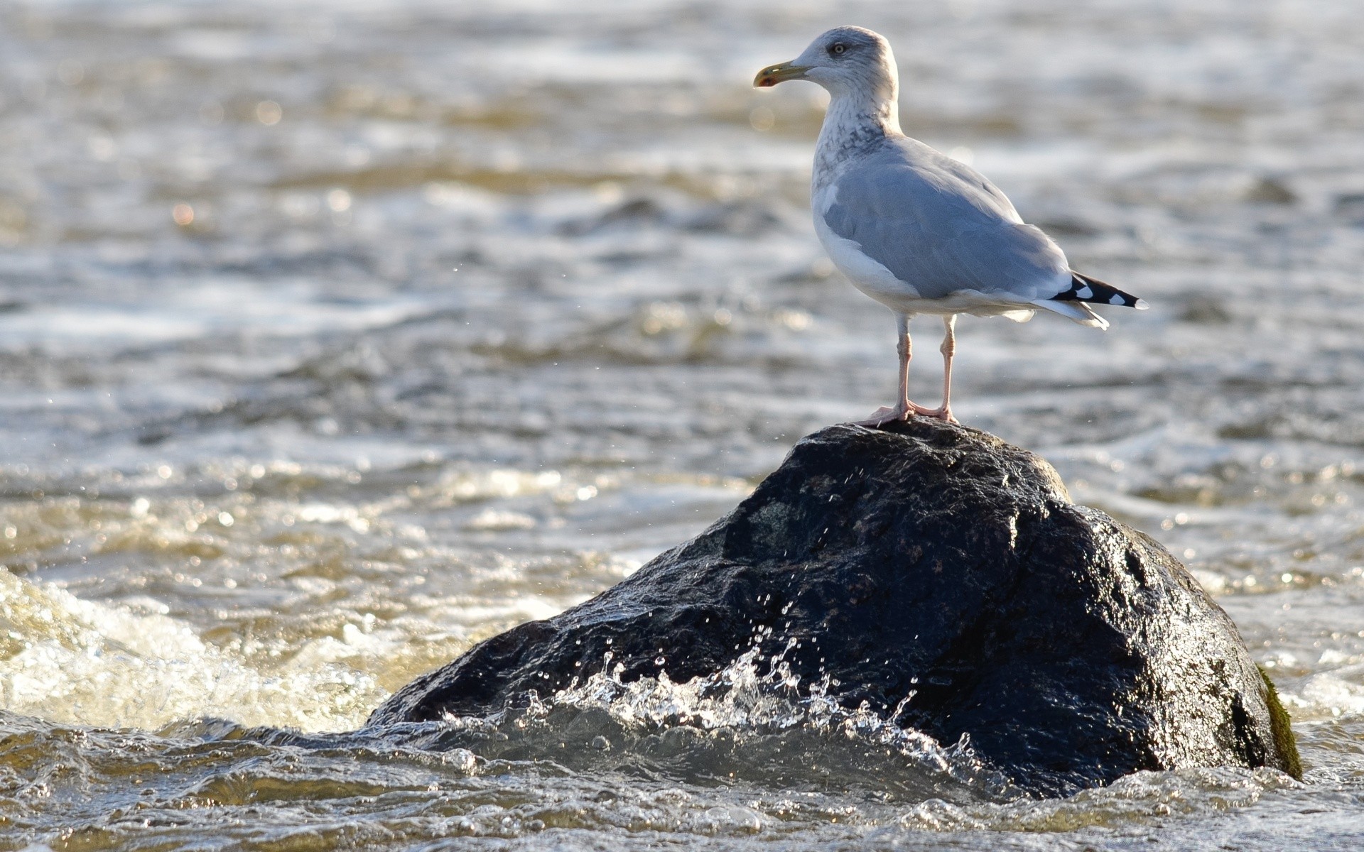 Eine Möwe auf einem Stein mitten im Meer ist schön