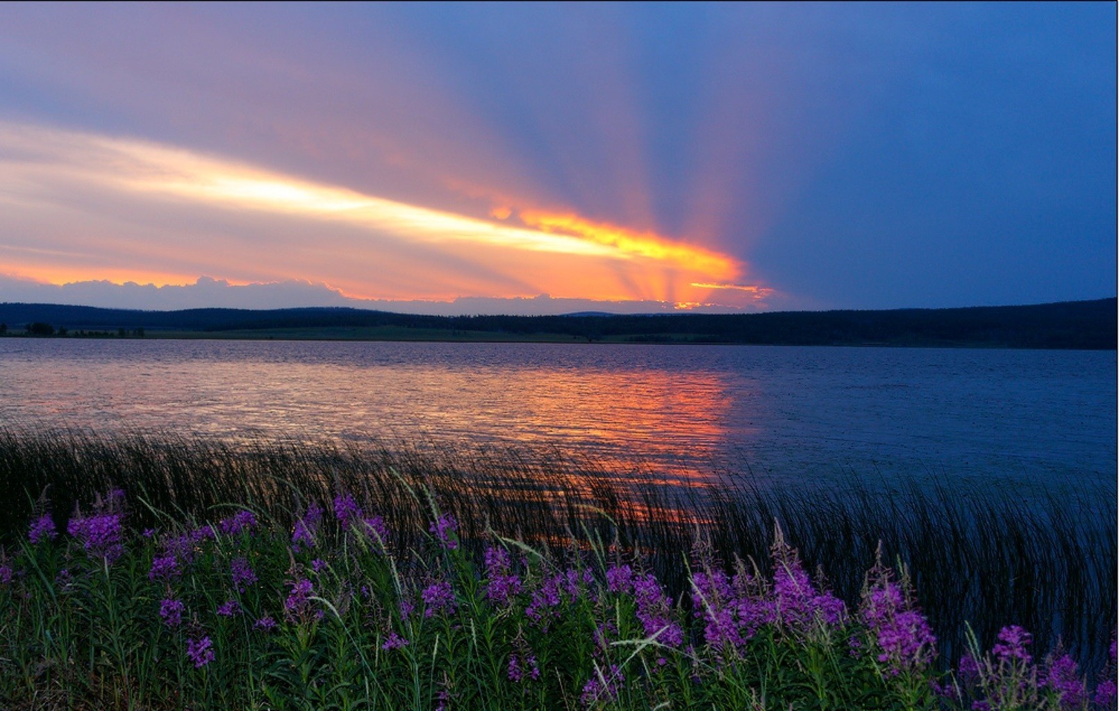 Niedriger sonnenuntergang über dem einsamen ufer des seesNiedriger Sonnenuntergang über dem einsamen Ufer des Sees