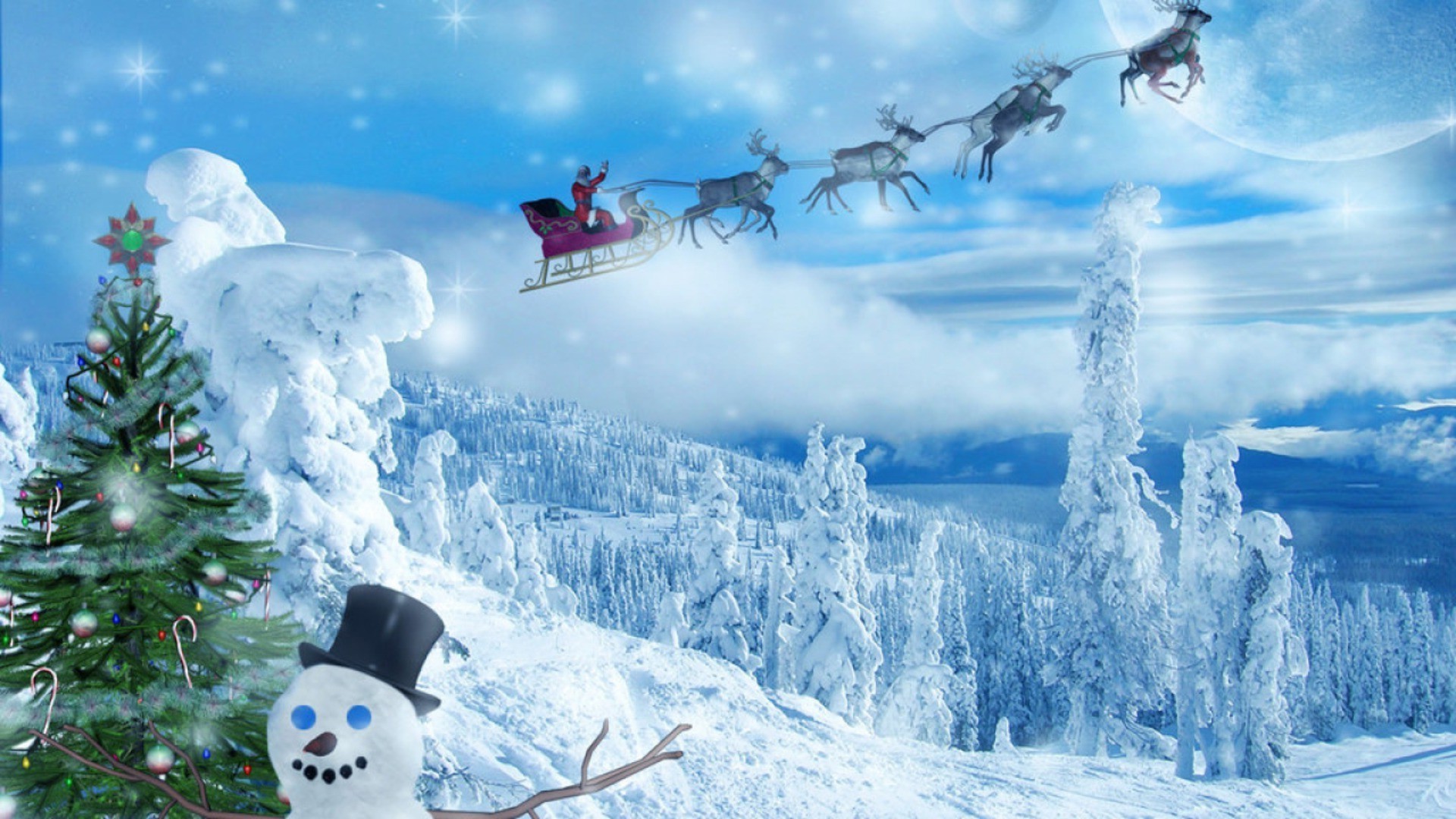 Der weihnachtsmann auf dem rentier eilt, um geschenke zu verteilenDer Weihnachtsmann auf dem Rentier eilt, um Geschenke zu verteilen