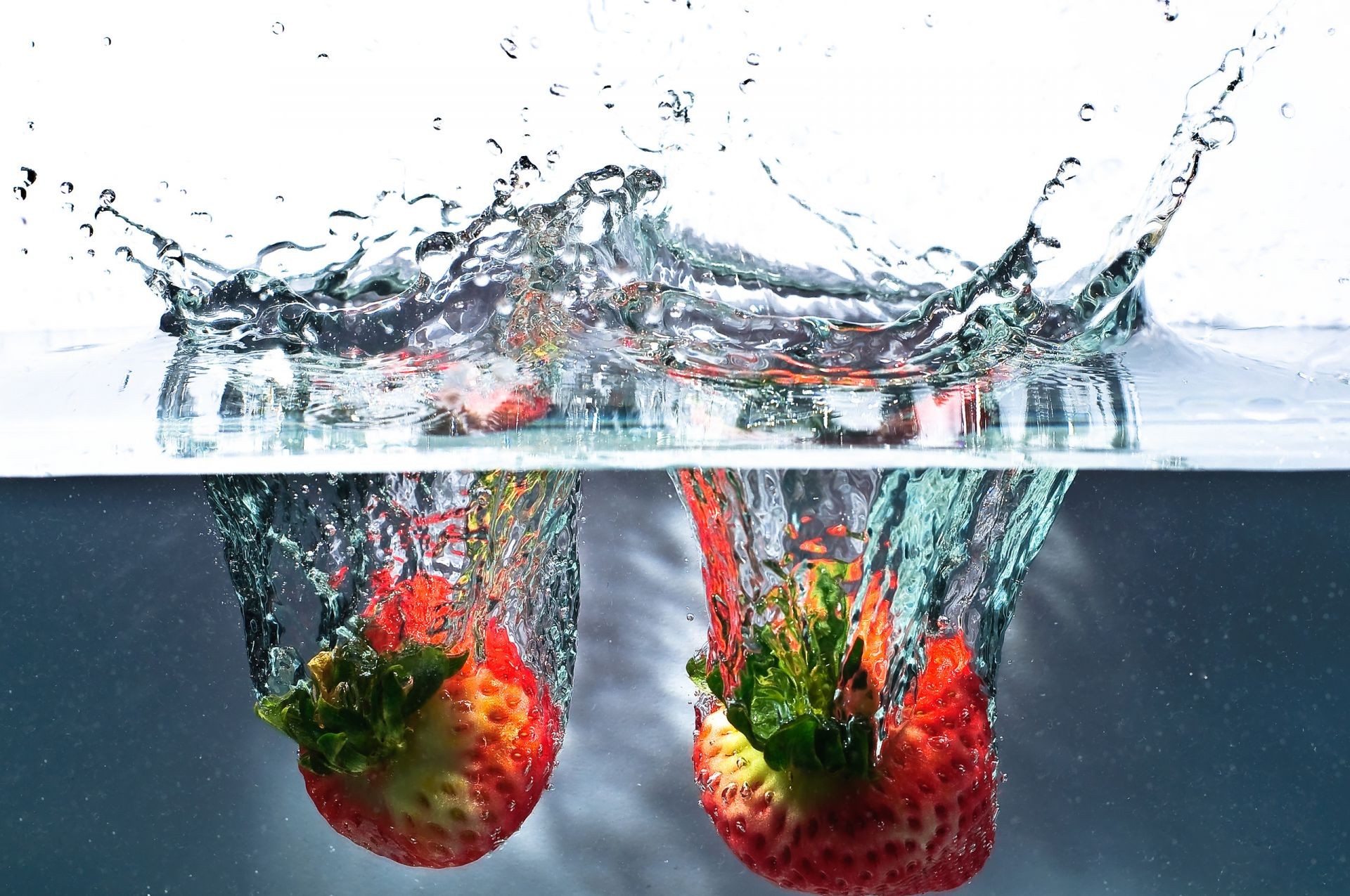 Mit einem Spritzer Erdbeeren ins Wasser fallen