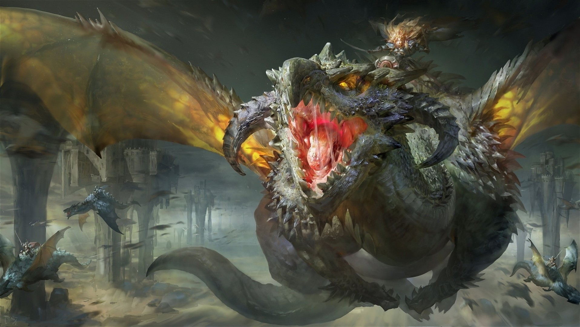 Ein Drache mit Flügeln, der an Vögeln und Fischen vorbeifliegt