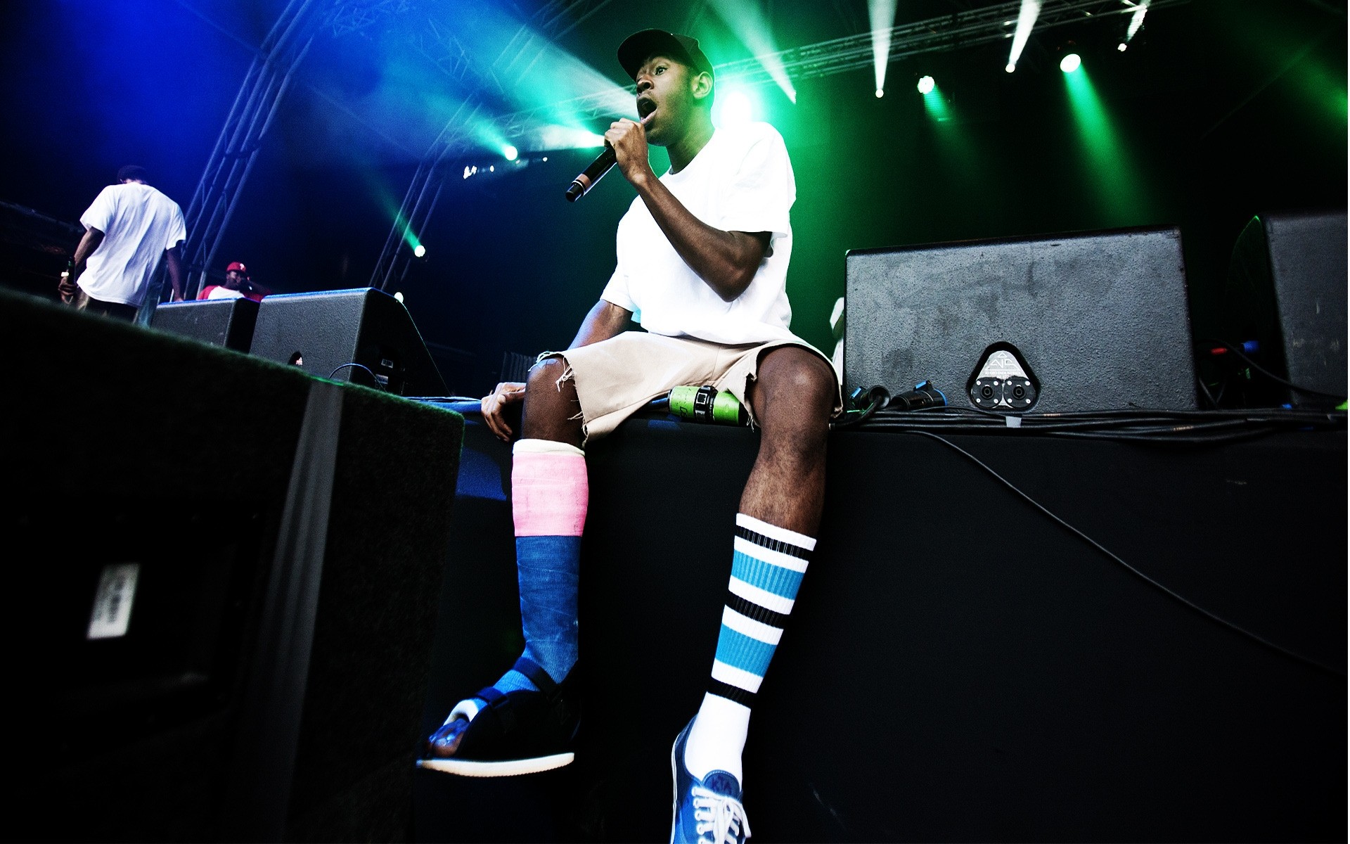Der Musiker singt bei einem Konzert. Grünes Licht