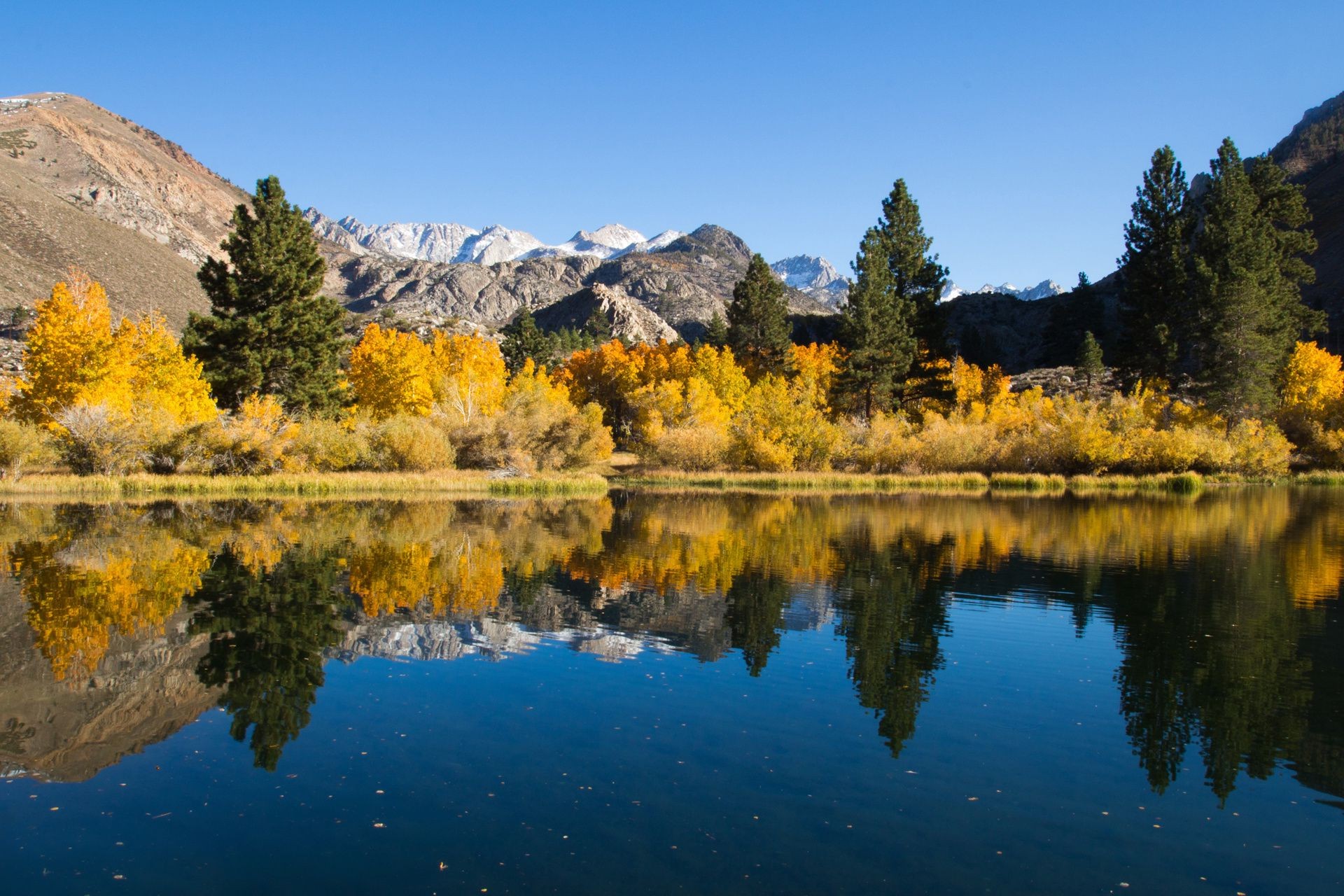 Herbstlandschaft von Bäumen, die sich im See widerspiegeln