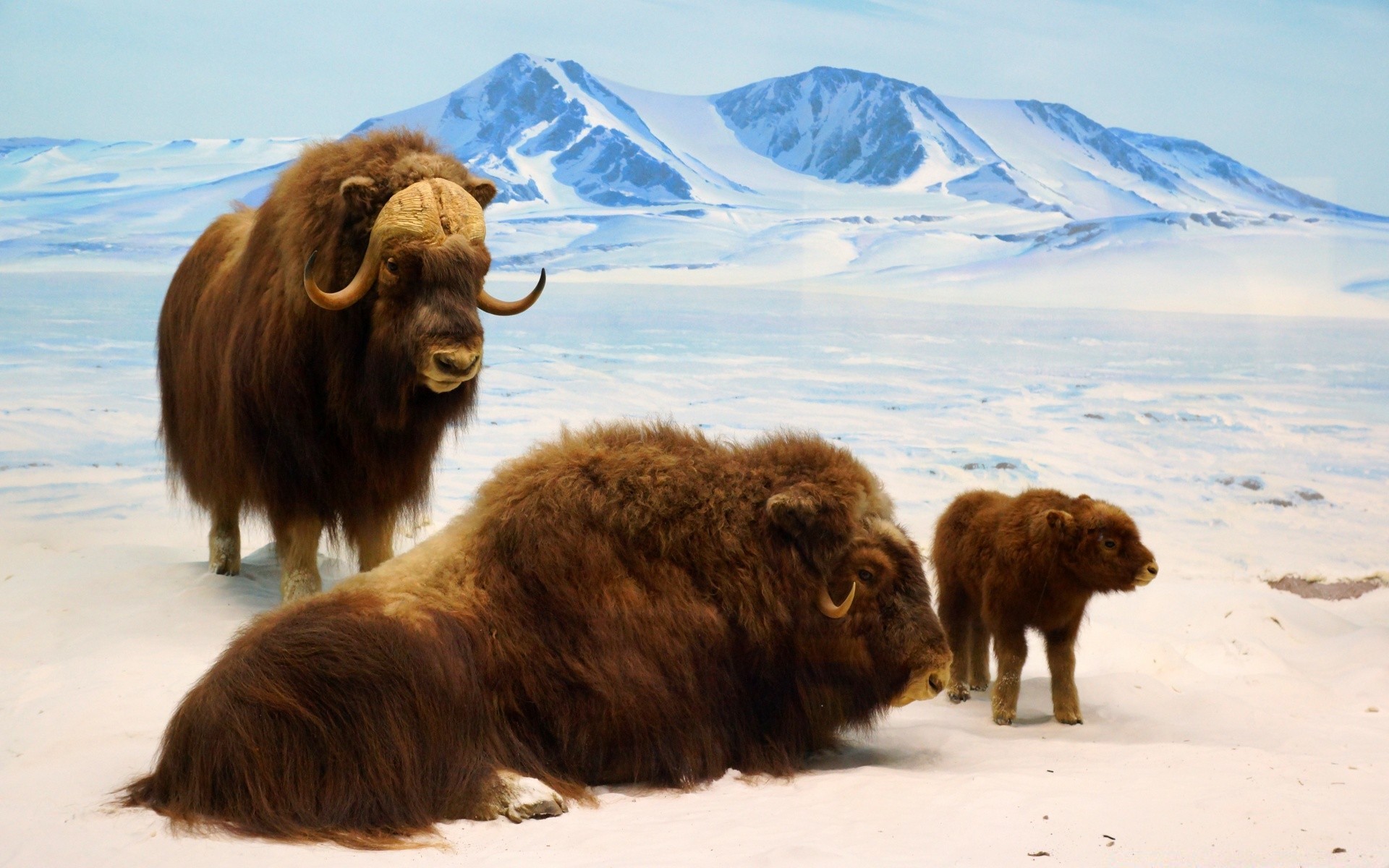 Eine familie von stieren, die sich auf einer schneebedeckten ebene vor dem hintergrund der berge ausruhtEine Familie von Stieren, die sich auf einer schneebedeckten Ebene vor dem Hintergrund der Berge ausruht