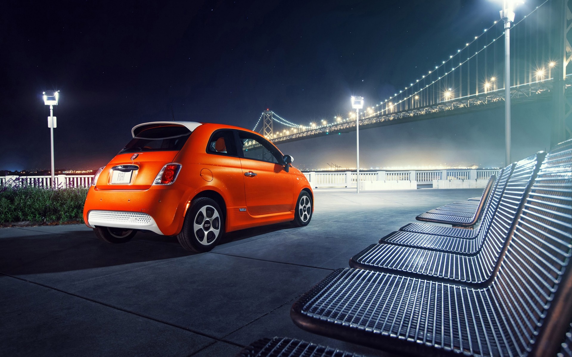 Orange auto geparkt an der promenade mit blick auf die brückeOrange Auto geparkt an der Promenade mit Blick auf die Brücke