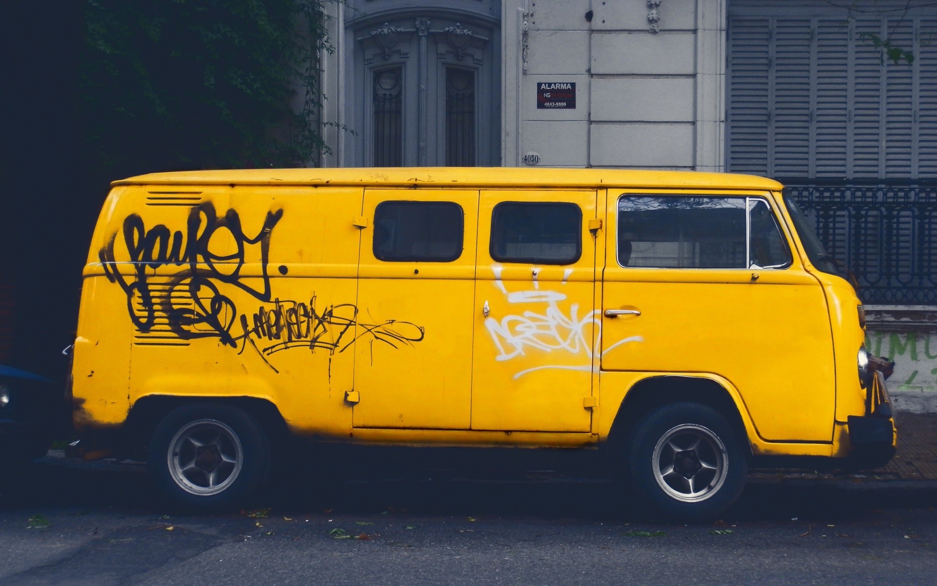 Gelber gezeichneter kleinbus in der nähe des abstellplatzes