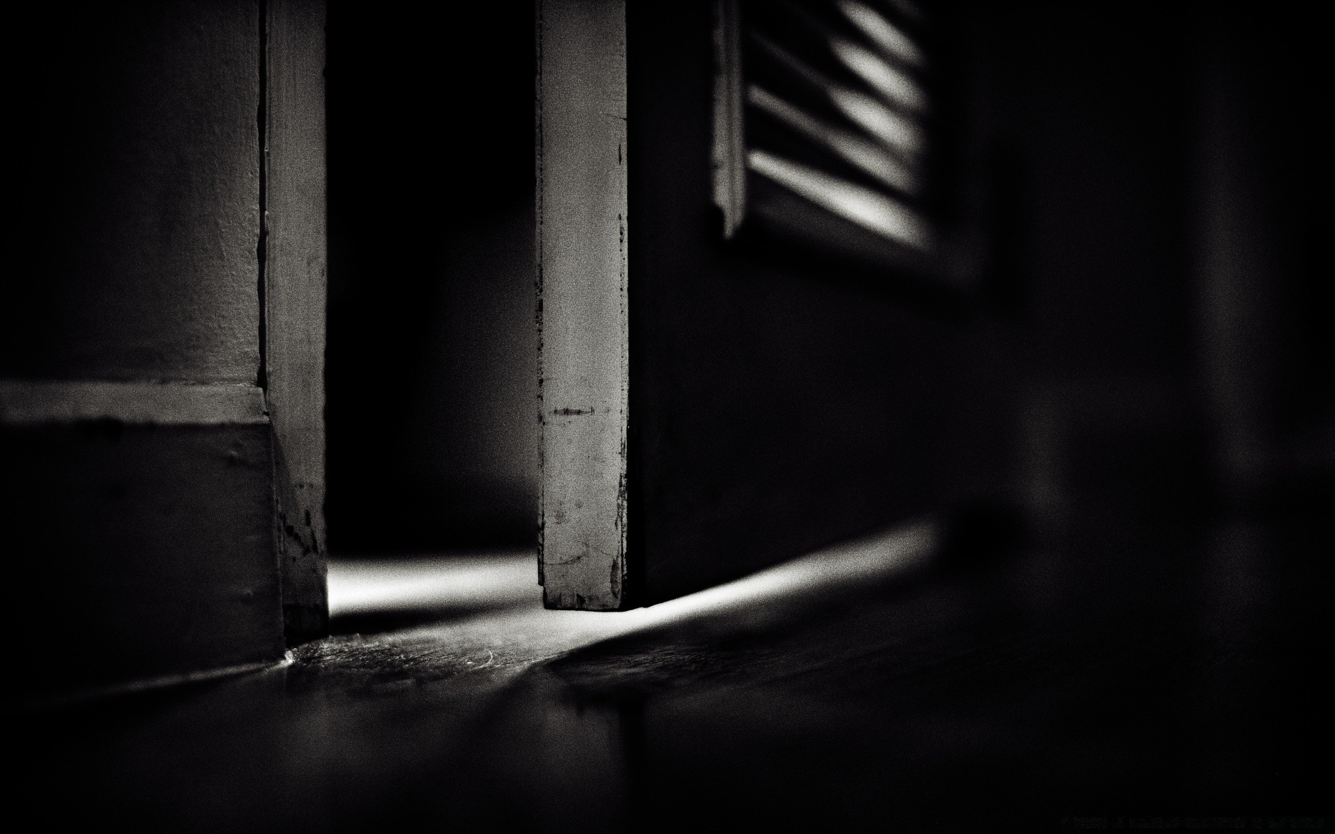 Schwarz-Weiß-Foto der Pfosten der offenen Tür