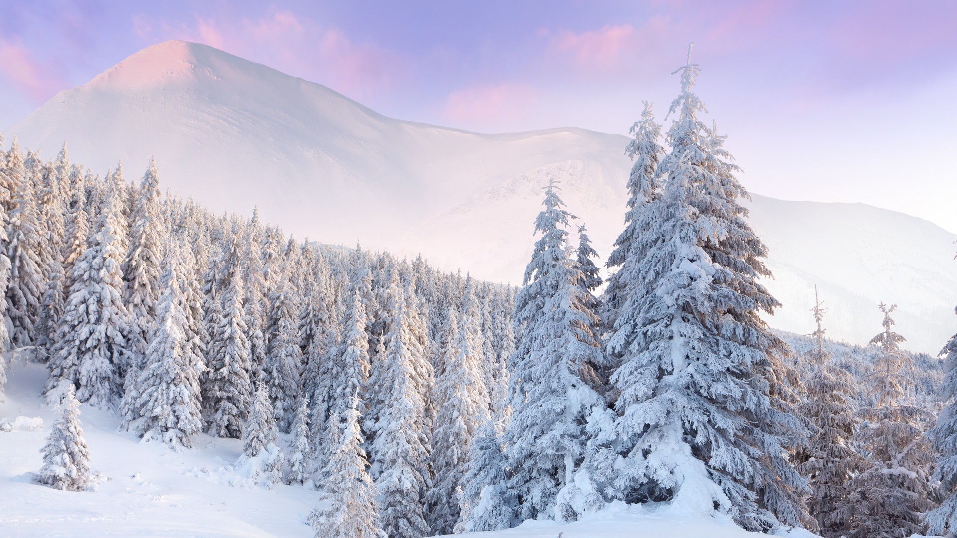 Die ungebrochenen weihnachtsbäume stehen mit schnee bedeckt am hang des bergesDie ungebrochenen Weihnachtsbäume stehen mit Schnee bedeckt am Hang des Berges