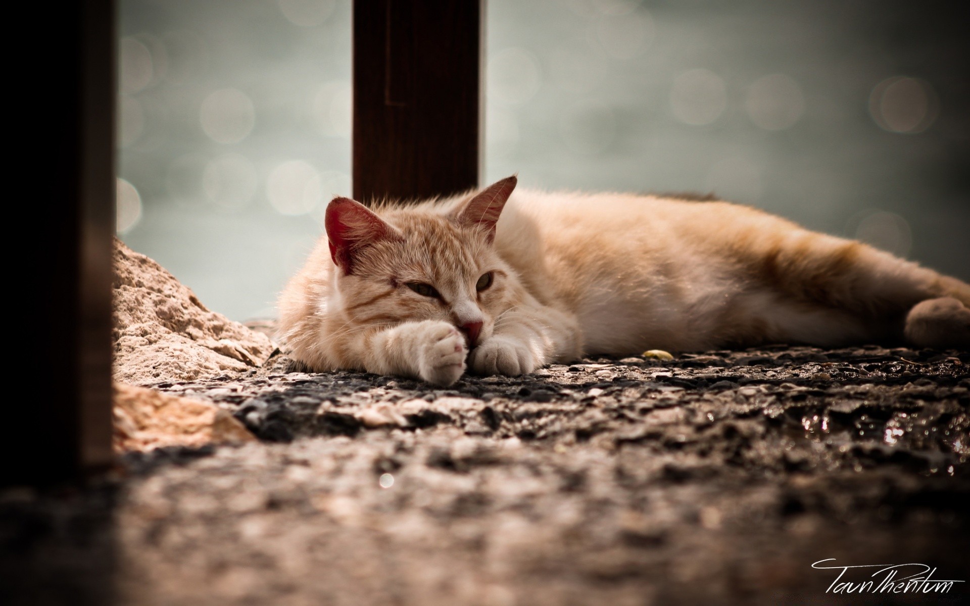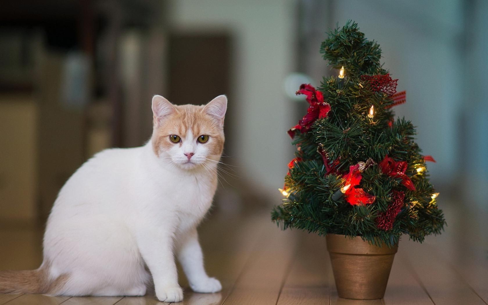 Die Katze sitzt neben einem kleinen Weihnachtsbaum