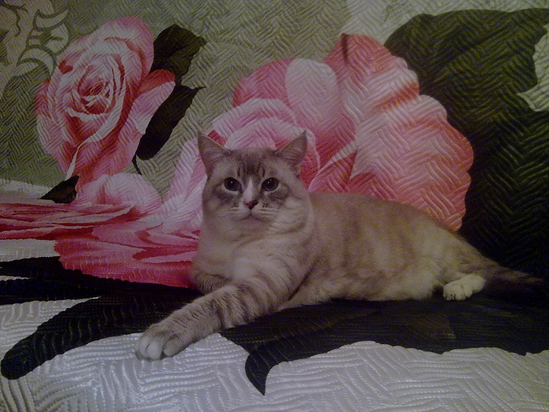 Eine reinrassige Katze liegt auf einer weißen Decke