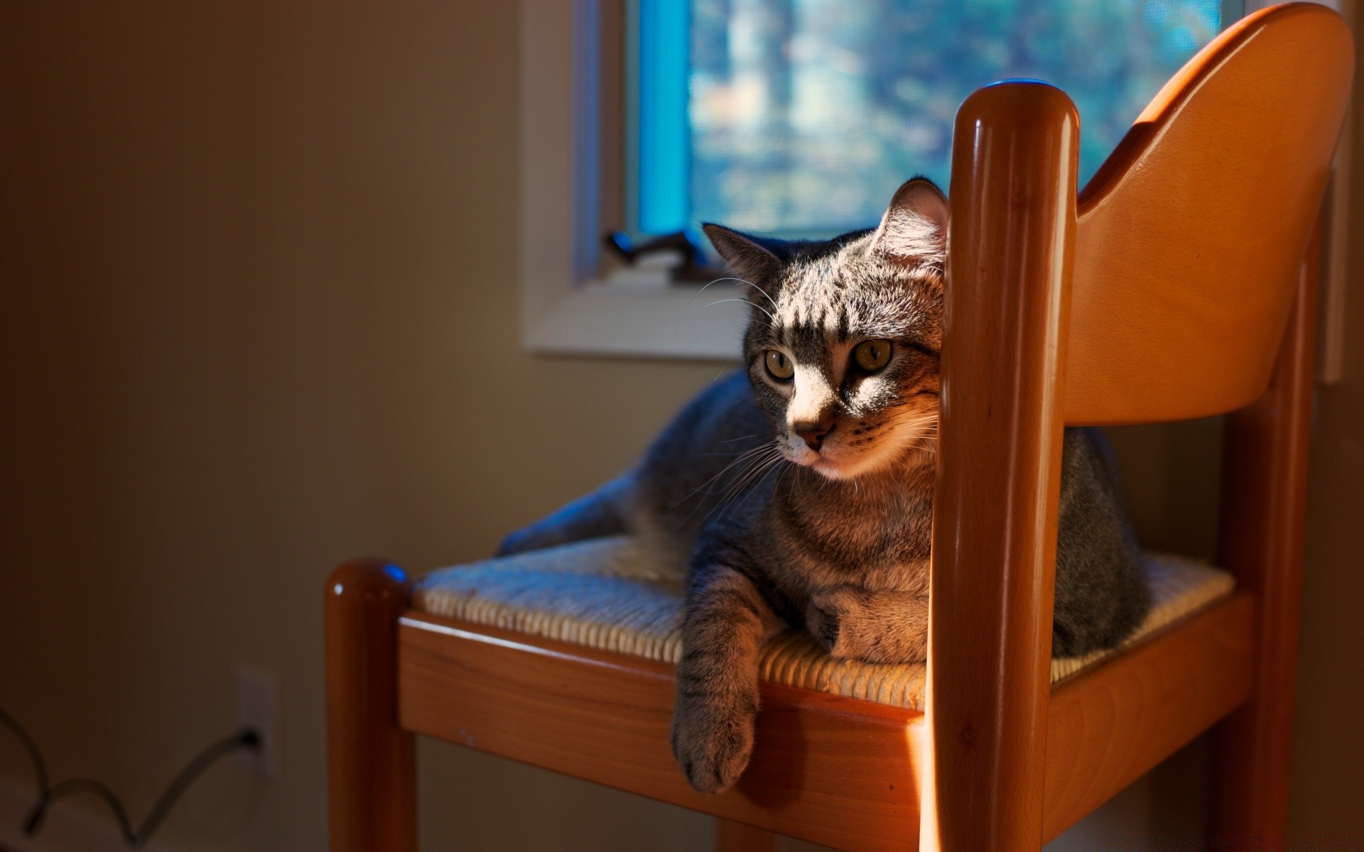 Eine graue Katze liegt auf einem Stuhl