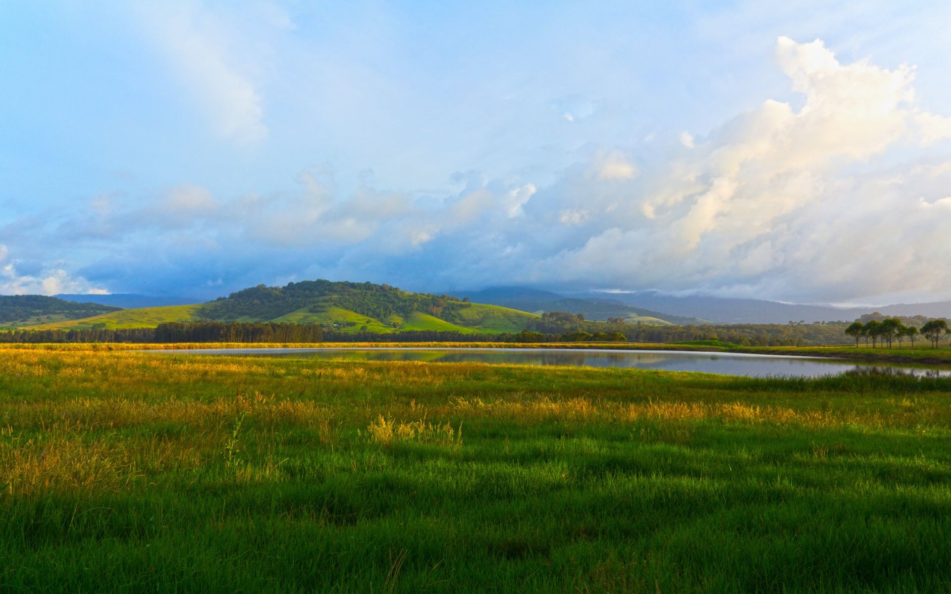 Die Sonne spiegelt sich in den Tautropfen auf dem Gras wider
