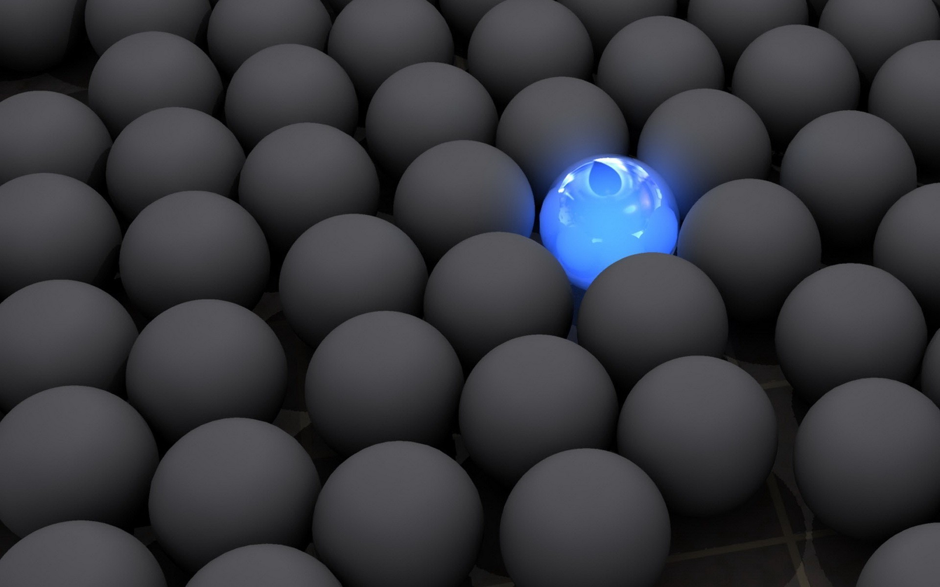 Eine leuchtende Kugel unter einem Dutzend grauen Kugeln